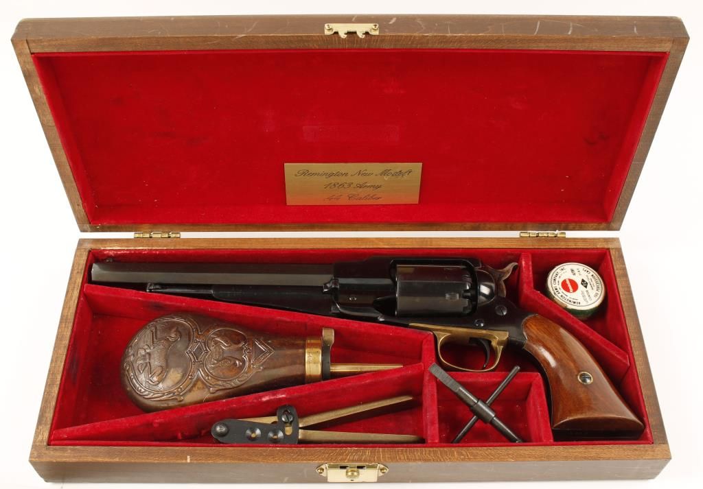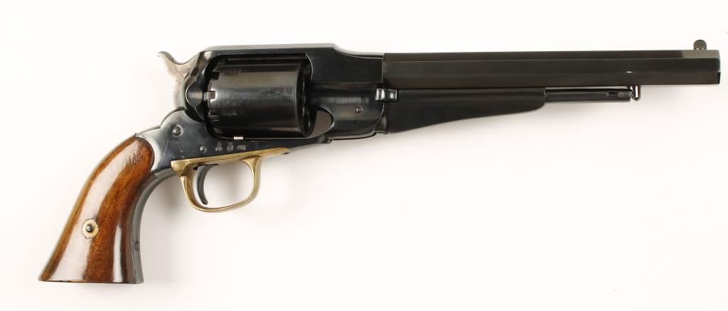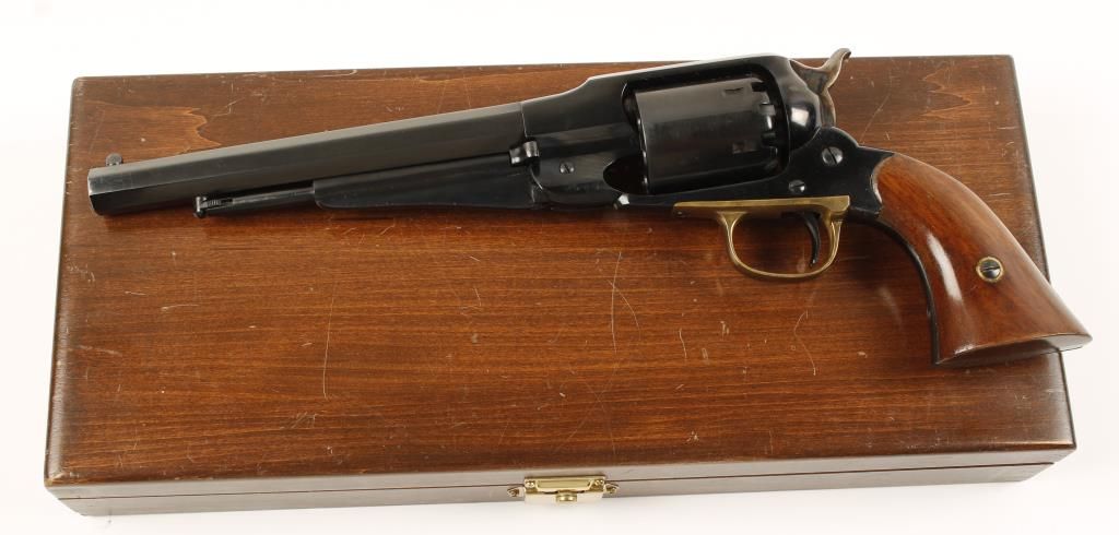 Cased replica black powder single action 6-shot percussion pistol. Blued 8" octagon barrel. Blued loading lever, cylinder, trigger and frame. Case colored hammer. Brass trigger guard. Not cut for a shoulder stock. Lined hardwood case with loading and maintenance tools. Condition is like new in box. *Antique Firearm*