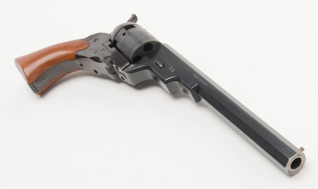 Navy Arms copy of a Colt Texas Paterson percussion revolver, .36 cal., 7-1/2” octagon barrel, blue finish, wood grips, #1617 in fine condition. Est.: $175-$300.