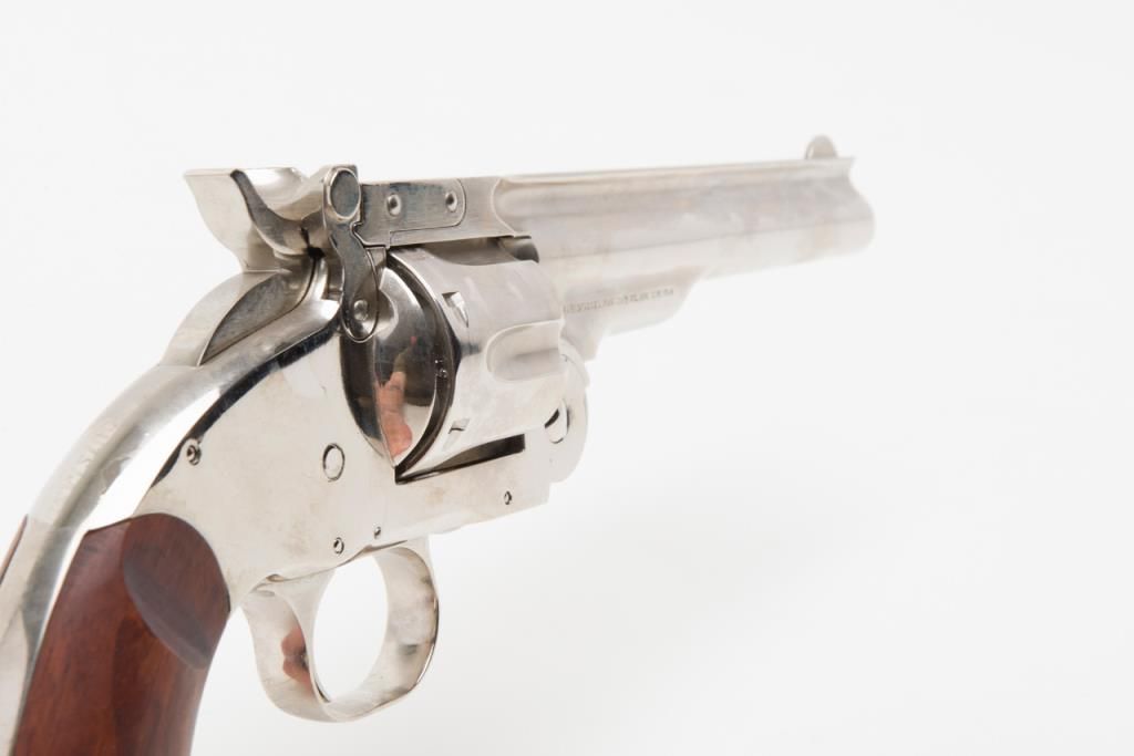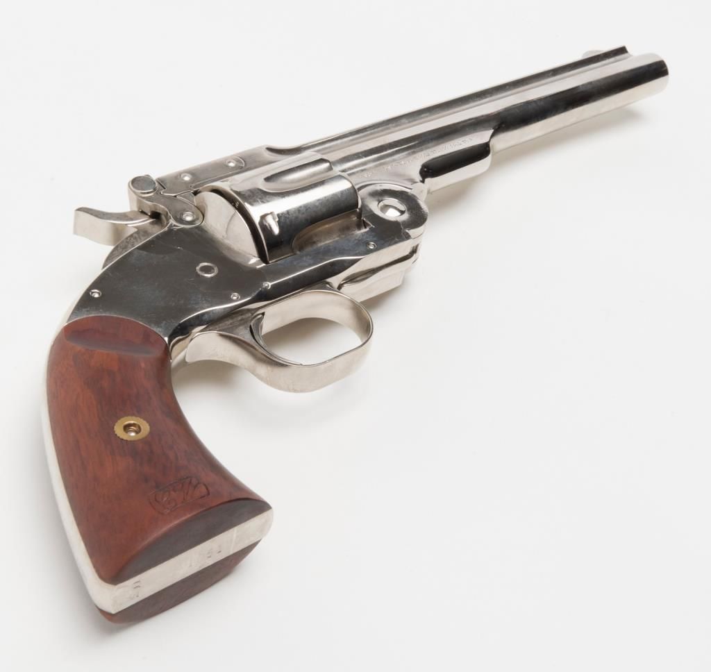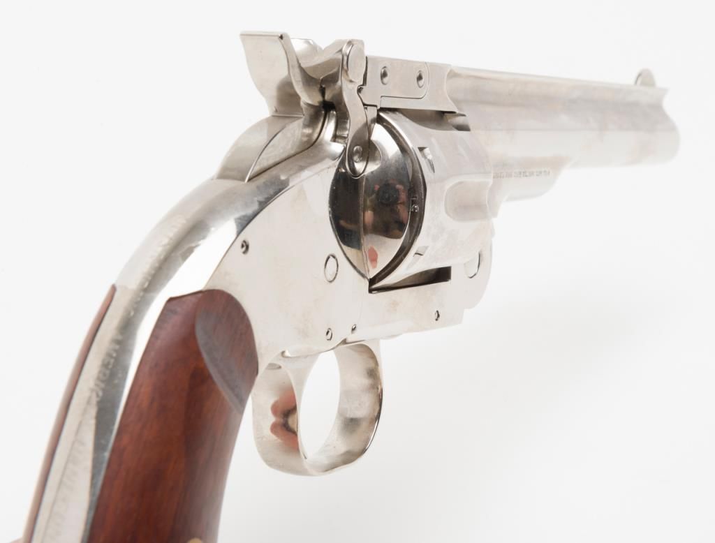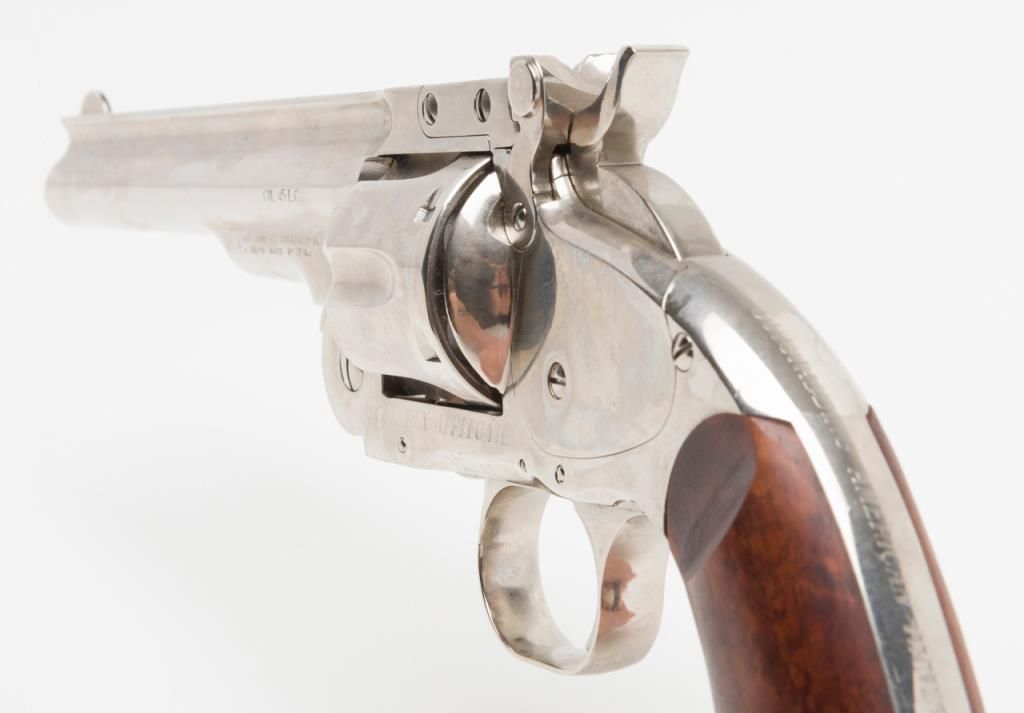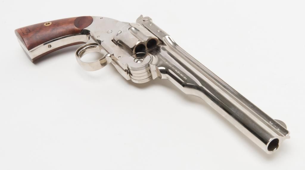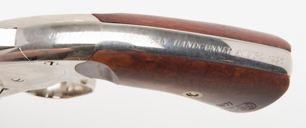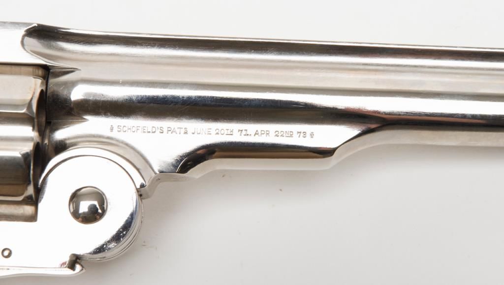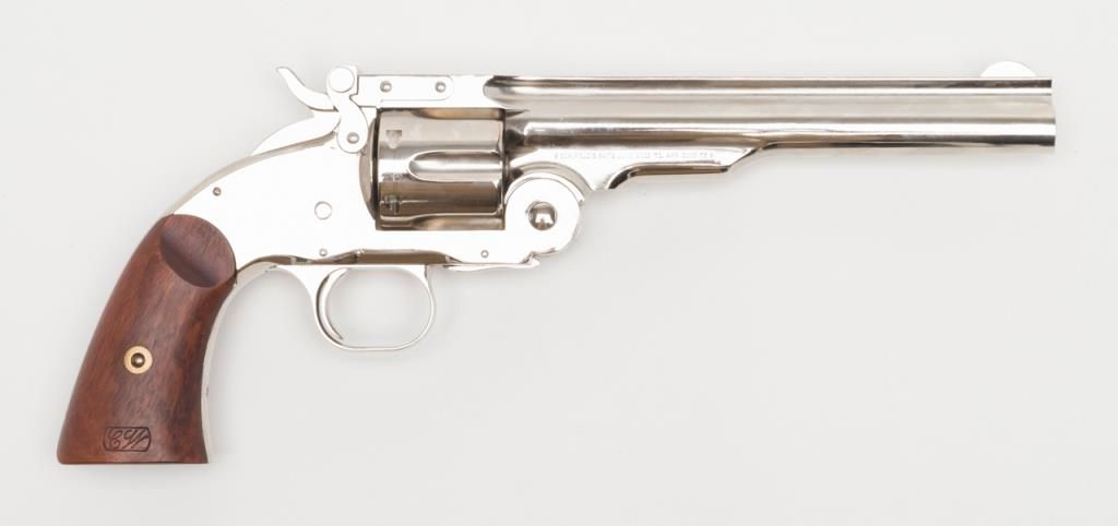 Navy Arms copy of a Smith & Wesson Schofield Single Action revolver, .45LC cal., 7” barrel, nickel finish, wood grips, #1051 and inscribed “Col., Rex Applegate” on the left side of the frame above the trigger guard; in overall finecondition with crisp action, markings, bore and grips. (Modern). Est.: $400-$800.
