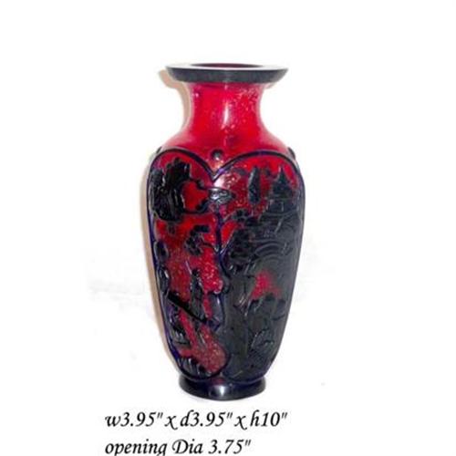 This unique Peking glass vase has the combination of navy blue overlay, which carved with vintage Chinese mountain and water scenery, and red base, which has gold flake mixed in. It is a very dark navy blue, without direct light, it almost is black color. But this is the special of the color which has different result under different lighting. </p>