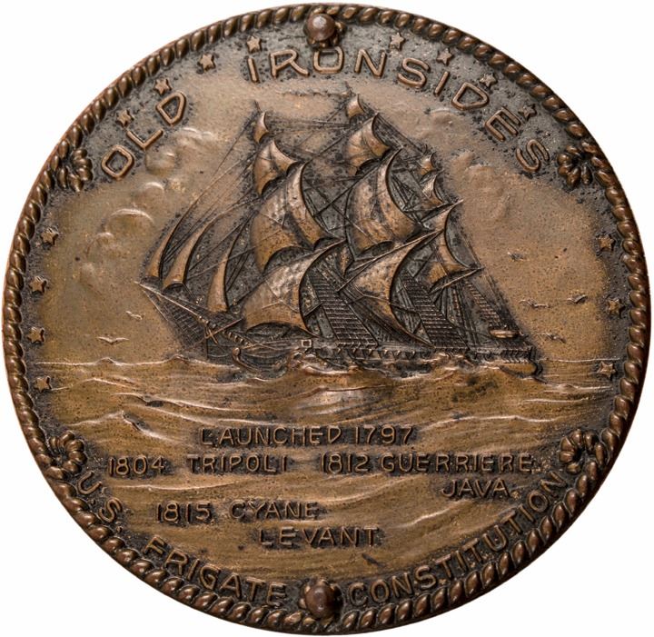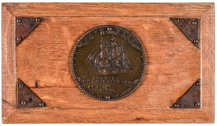 The American Frigate USS Constitution was launched in 1797 as one of the original ships of the United States Navy. In 1927 it underwent a major renovation, and materials that were replaced were sold to raise money for the effort. This beautifully crafted Wooden Keepsake Box with fitted lid made from original Wood and likely Paul Revere Supplied Copper, salvaged from the USS Constitution (a.k.a. “Old Ironsides”) during its rebuilding in 1927, measuring 7” x 2.5” x 4”. The corners of the tiered lid and the bottom sides are decorated with triangles of copper. The top lid has a round Copper Medallion and there is a rectangular panel on the front that provides information on the ship. Top medallion; Across the top rim above an intricate and beautiful bas-relief of the frigate: “OLD IRONSIDES”, beneath the ship: “LAUNCHED 1797, 1804 TRIPOLI, 1812 GUERRIERE JAVA and 1815 CYANE LEVANT”, around the curve on the bottom: “U.S. FRIGATE CONSTITUTION”. Front marker reads; “THIS MATERIAL WAS TAKEN FROM THE ORIGINAL HULL OF THE U.S. FRIGATE CONSTITUTION KEEL LAID 1794 REBUILDING 1927”. There is a fine crack on the front right side panel and lacking one small nail. A highly popular commemorative example from our most historic Navy ship, now located at Boston harbor and the first of this type we have offered.