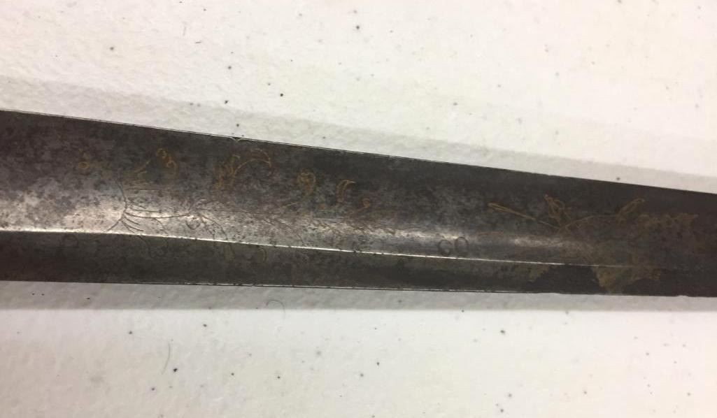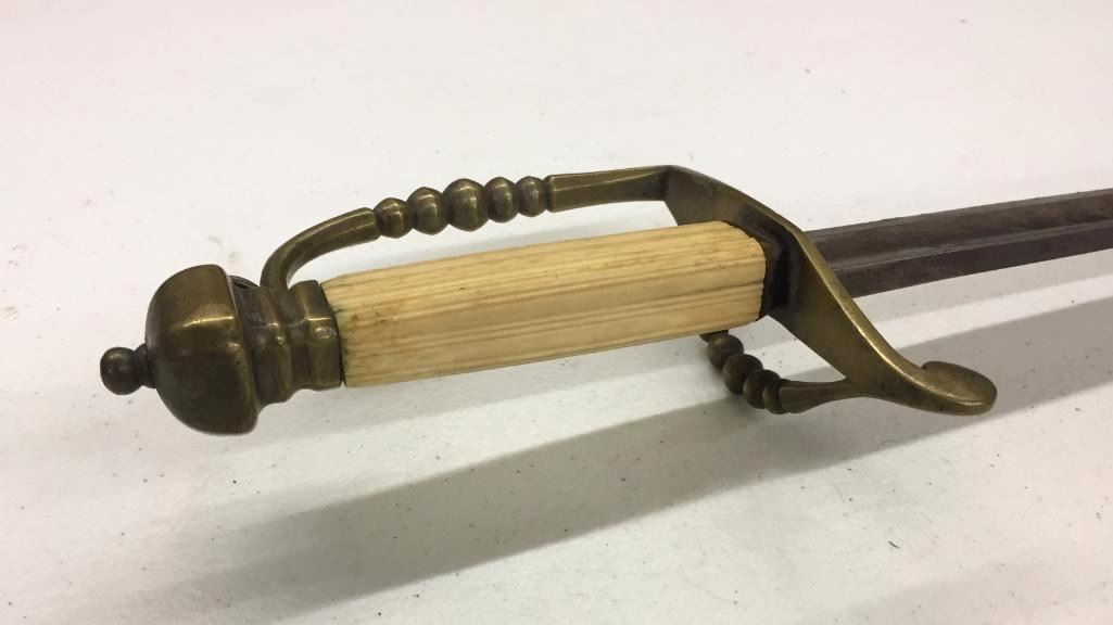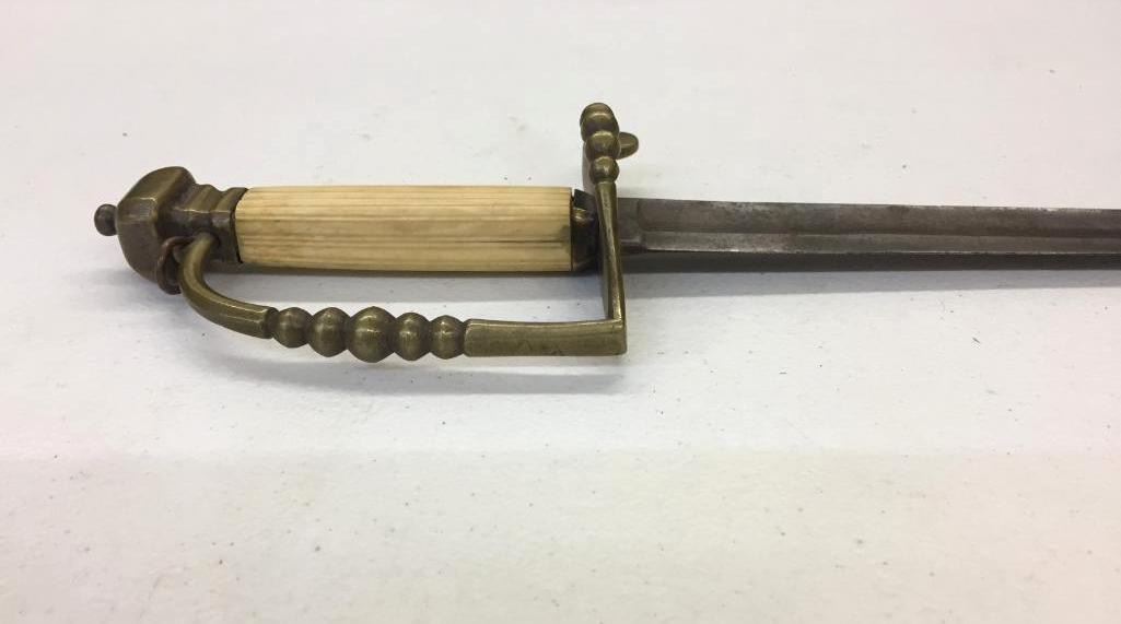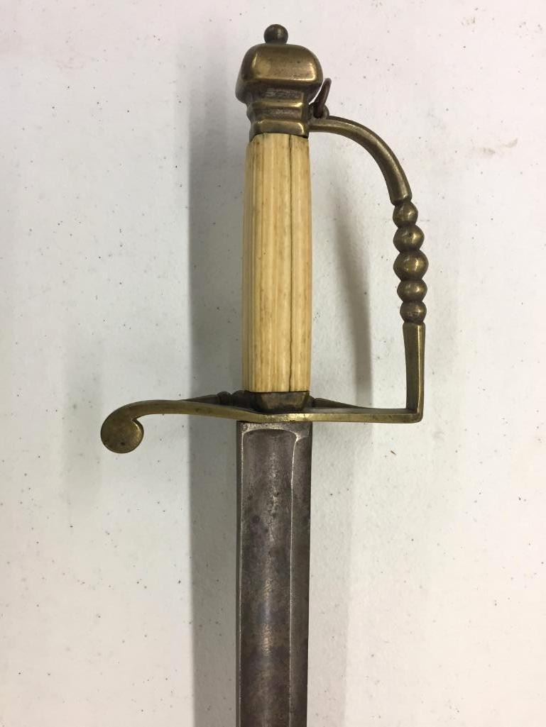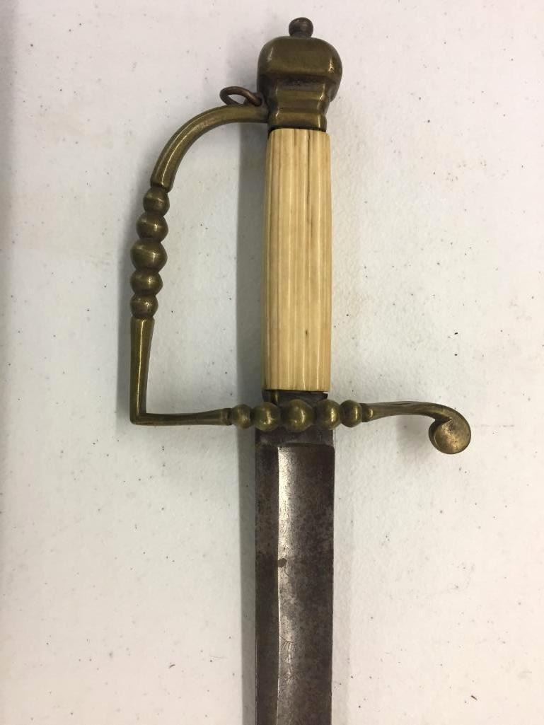 For sale in this lot is a Navy Officers Mounted Spadroon from the Revolutionary War Era. It still has some original finish and gold gilting on the blade. It has a carved bone, 5-ball handle. Please note there is a crack on the handle. Maker: Unmarked that we could tell. Approx. Age: Circa Revolutionary war era. Size: 38 inches long overall. Condition: Good for its age, some wear and aging expected. Please note there is a crack on the handle. Please look closely at the pictures - they are an important part of our description. Shipping: There will be a $15 handling / packaging fee for shipping this lot. The actual cost of postage will be added on top of that. BUY IT NOW: If you would like to buy this item now without waiting for the auction to end (this option is only available up to 48 hours before the auction starts to close), the “Buy it Now” price is the high estimate of this lot. If you would like to end the auction early and pay the high estimate (plus applicable fees), please contact us by phone or email and reference this lot number.