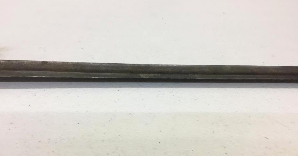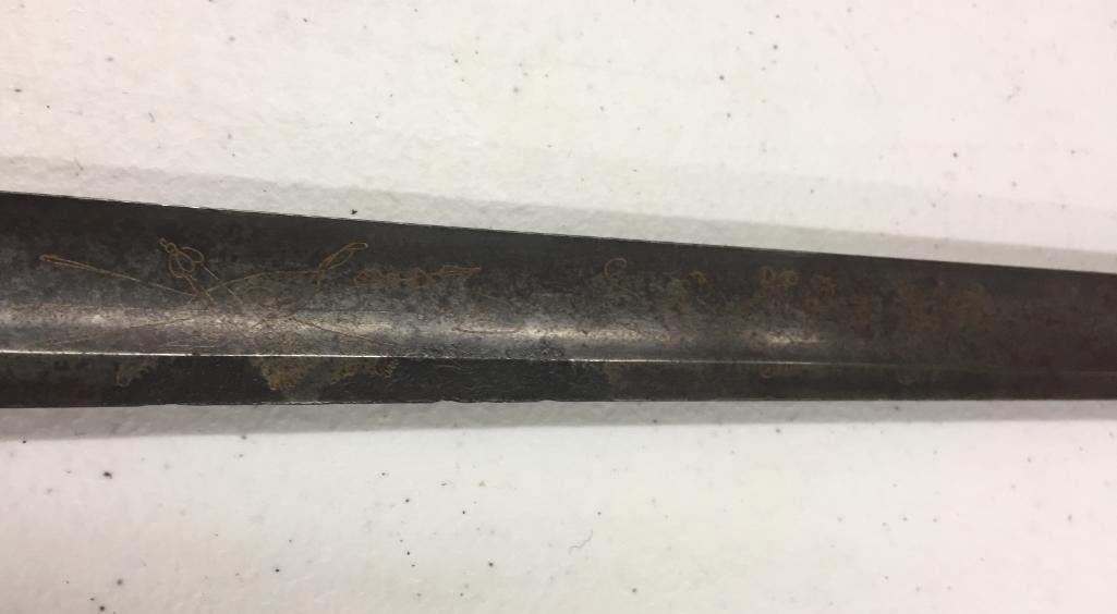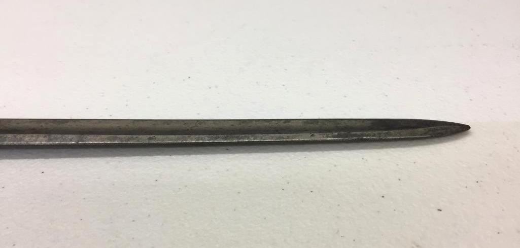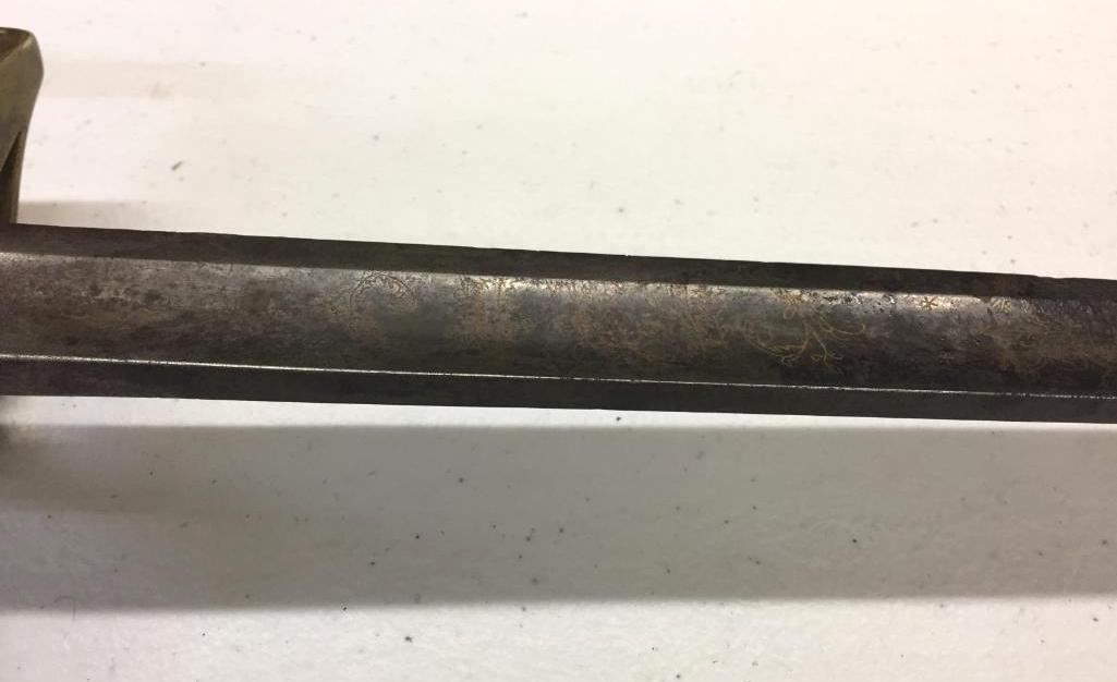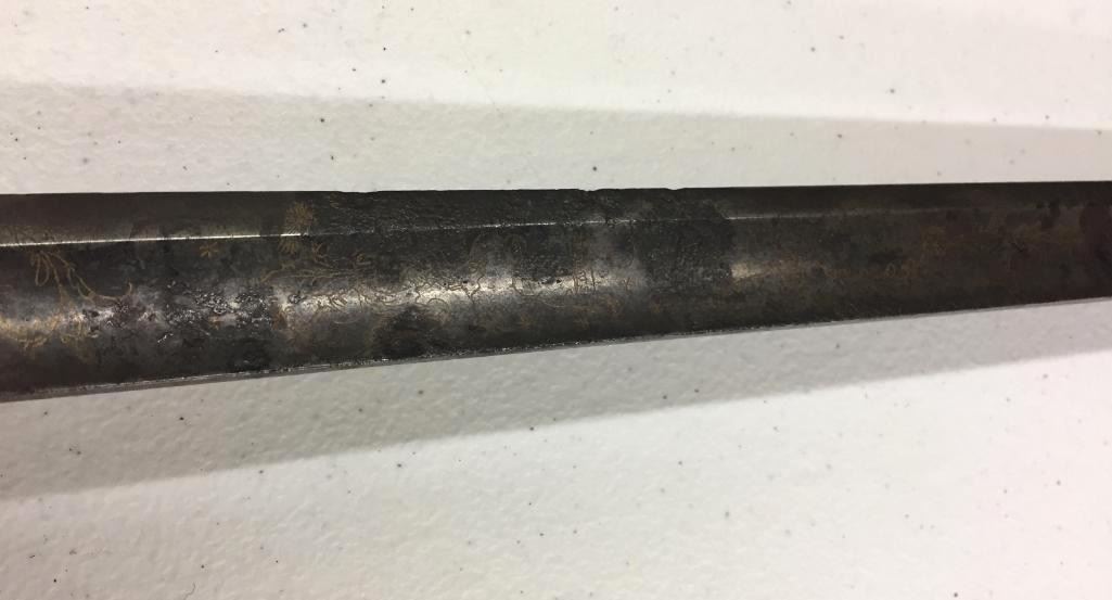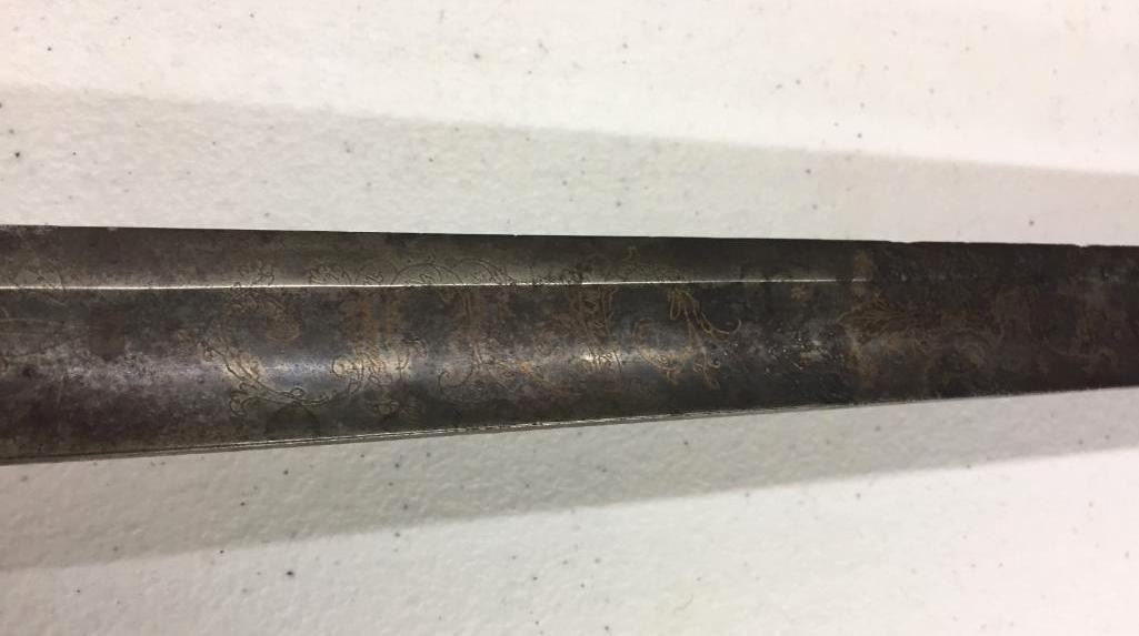 For sale in this lot is a Navy Officers Mounted Spadroon from the Revolutionary War Era. It still has some original finish and gold gilting on the blade. It has a carved bone, 5-ball handle. Please note there is a crack on the handle. Maker: Unmarked that we could tell. Approx. Age: Circa Revolutionary war era. Size: 38 inches long overall. Condition: Good for its age, some wear and aging expected. Please note there is a crack on the handle. Please look closely at the pictures - they are an important part of our description. Shipping: There will be a $15 handling / packaging fee for shipping this lot. The actual cost of postage will be added on top of that. BUY IT NOW: If you would like to buy this item now without waiting for the auction to end (this option is only available up to 48 hours before the auction starts to close), the “Buy it Now” price is the high estimate of this lot. If you would like to end the auction early and pay the high estimate (plus applicable fees), please contact us by phone or email and reference this lot number.