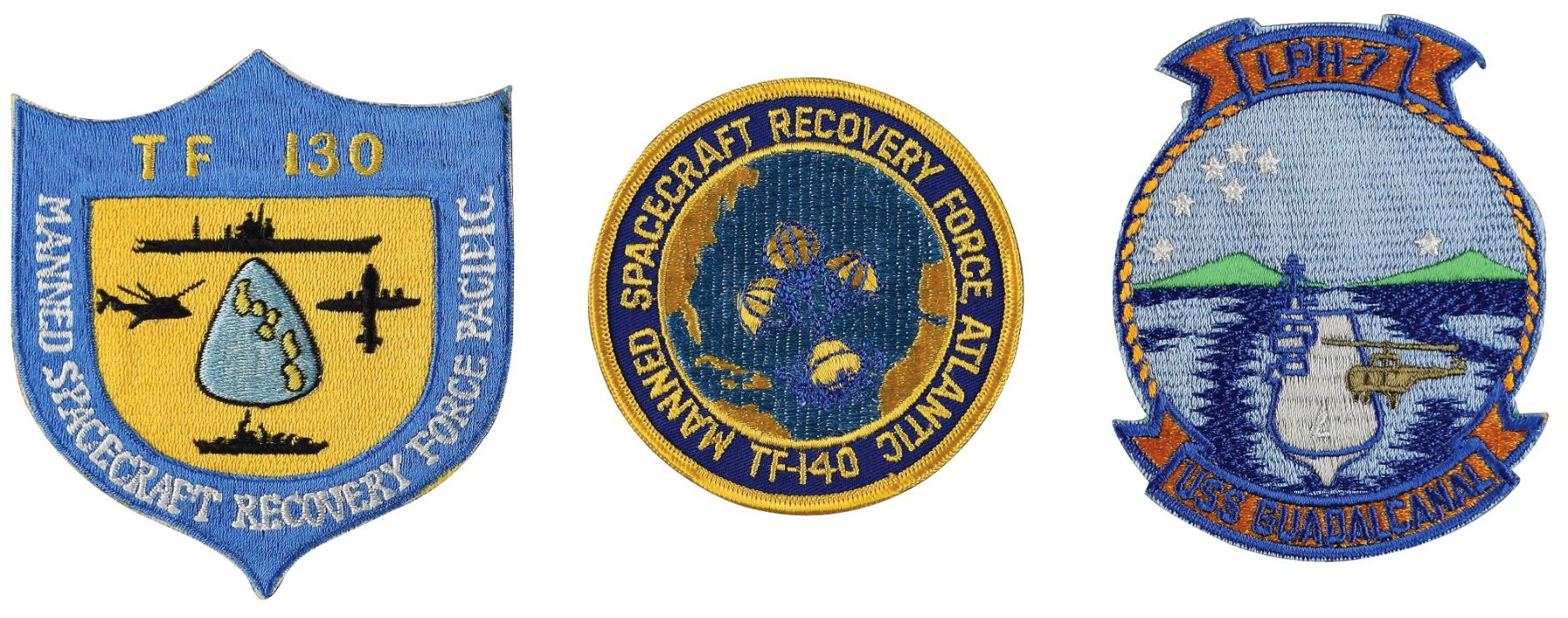 Three embroidered recovery patches: a 4 x 5 patch for the USS Guadalcanal (LPH-7) recovery ship, which retrieved the crew of Apollo 9 in the North Atlantic Ocean on March 13, 1969; a 4-inch diameter patch for TF-140, the Atlantic Recovery Force under control of the Atlantic Recovery Control Center (RCCA) based at Norfolk, Virginia; and a 4.75 x 5.25 patch for TF-130, the Pacific Recovery Force under control of the Pacific Recovery Control Center (RCCP) based at Kunai, Hawaii. In overall fine condition. From the personal collection of Paul Kruppenbacher, a member of the NASA Houston Landing and Recovery Division who trained Apollo astronauts in water recovery procedures and was deployed on U.S. Navy aircraft carriers for crew and spacecraft recovery operations.