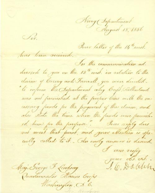 JAMES DOBBIN. LS. 1pp. 7 3/4" x 9 3/4". Navy Department. August 15, 1856. A letter signed "J. C. Dobbin" as Secretary of the Navy. He wrote to "Maj. George F. Lindsay Quartermaster Marine Corps": "In the communication addressed to you...in relation to the claim of Creevy and Farwell, you were directed 'to inform the Department why Capt. Sutherland was not furnished at the proper time with the necessary funds for the payment of the claim, and also state the time when the funds were furnished him for the purpose.' Your reply does not meet that point, and your attention is specifically called to it. An early answer is desired." The letter is in fine condition with white paper and dark ink.