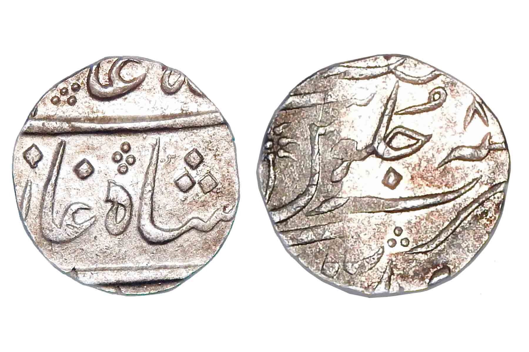 Nawabs of Surat – Silver rupee in the name of Shah Alam II, Surat mint, RY8, die-slippage on reverse hence double strike, KM 724, 10.90 grams. Very Fine+, Scarce.