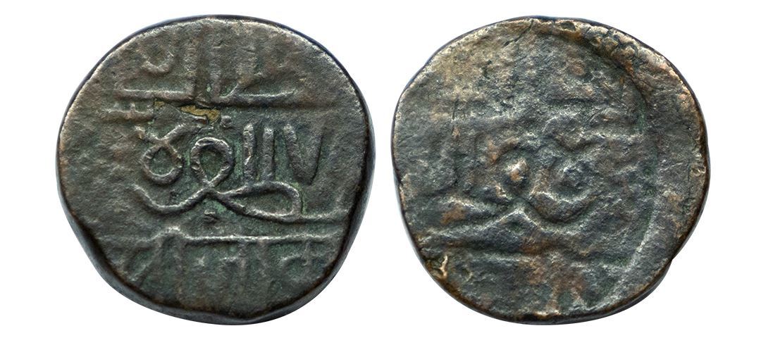 Nawanagar, copper dhinglo, AH 978, obverse brockage (lakhi) showing retrograde impression on reverse