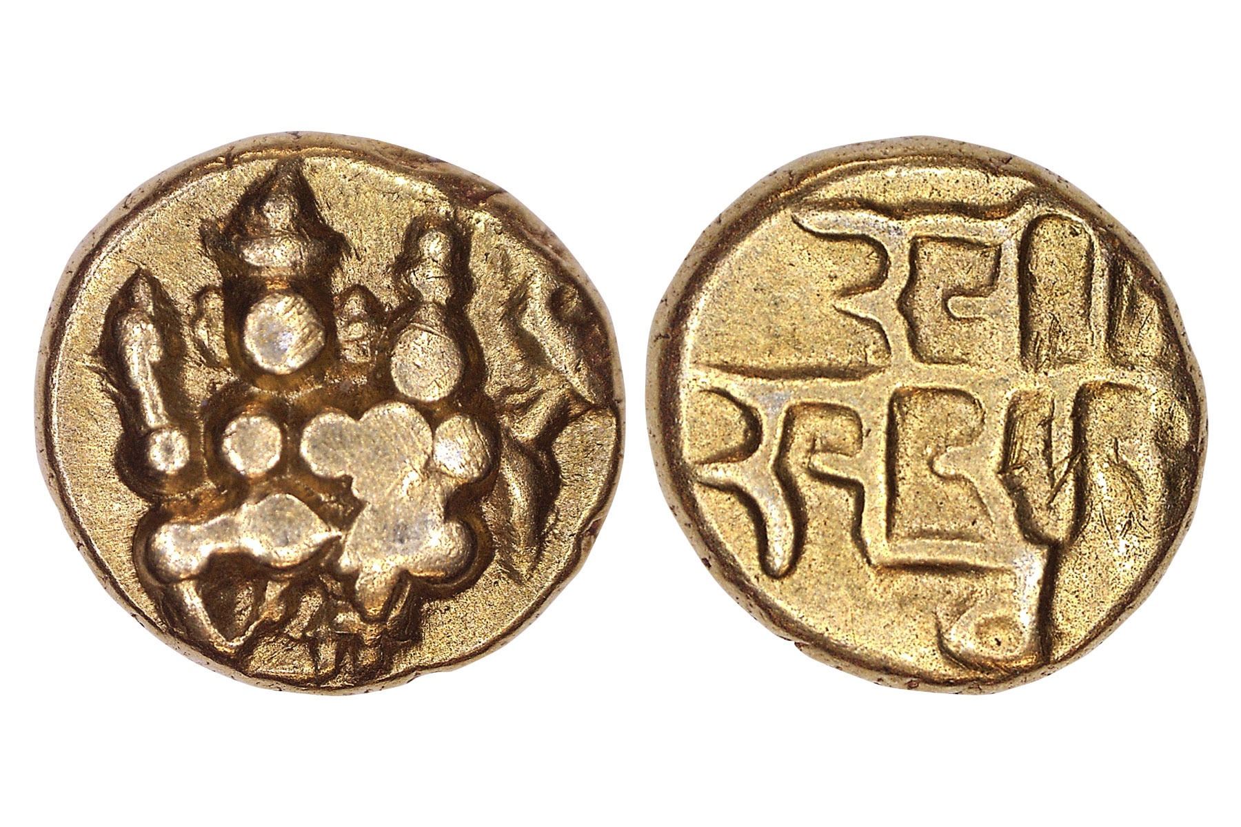 Nayakas of Ikkeri (Keladi/Bednur), Gold fanam in the name of Sadashiva Nayaka (1530-1566 AD), MCSI 892, 0.40 grams. Obv: Siva and Parvati seated. Rev: Devanagari Legend Sri / Sadasi / Va in three lines. VF+, Scarce.