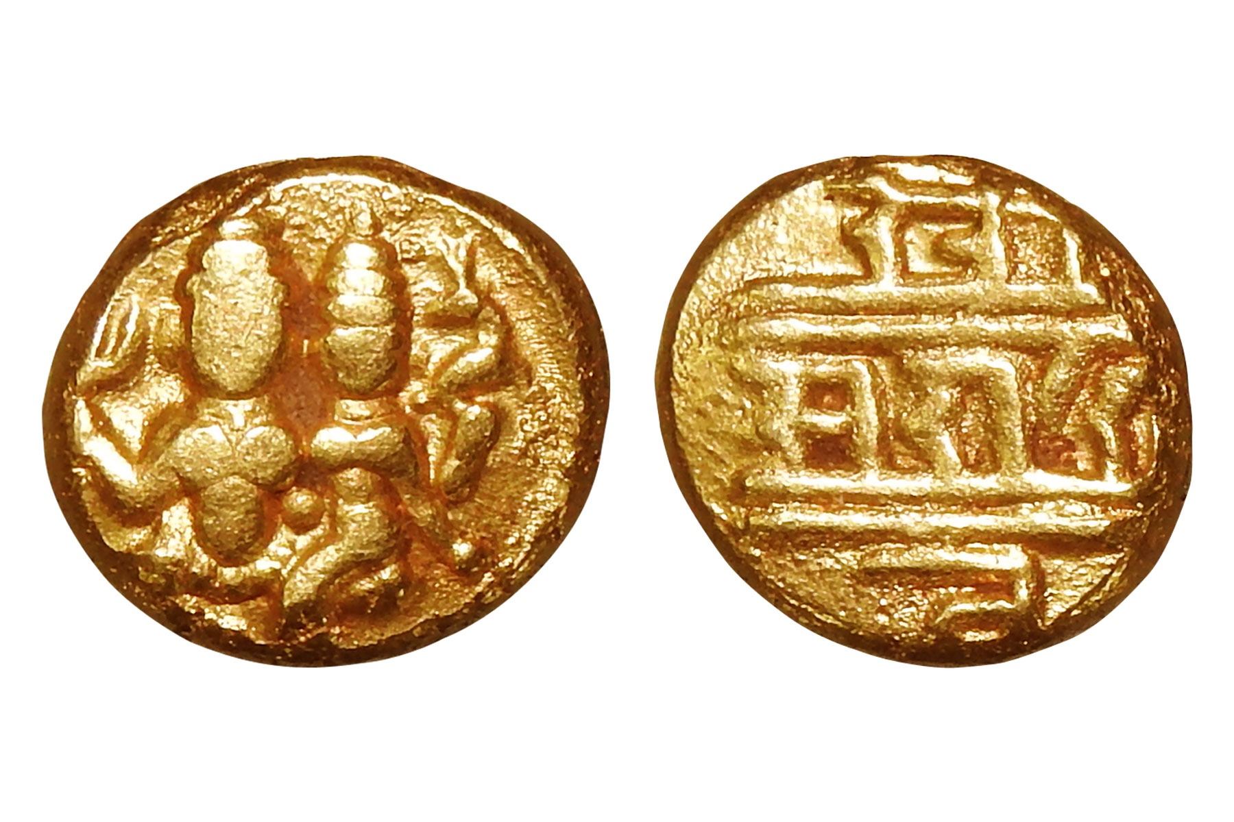 Nayakas of Ikkeri (Keladi), Gold hon/ pagoda in the name of Sadashiva Nayaka (1530-1566 AD), MCIS 891, 3.40 grams. Obv: Shiva and Parvati seated facing. Rev: Devanagari legend Shri/ Sadashi /va separated by double lines. The ‘Ikkeri’ hons were minted at many places in Northern Karnataka under different political authorities. It is likely that this variety is a Maratha issue. Very fine+, Scarce.