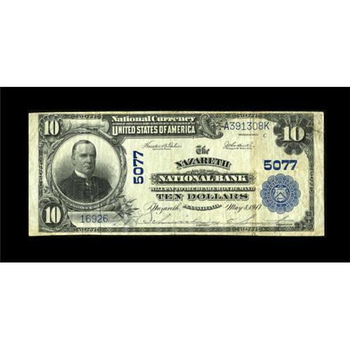 <B>Nazareth, PA</B></I> - $10 1902 Plain Back Fr. 632 <B>The Nazareth NB</B></I> Ch. # 5077<BR> A seldom seen bank in large size. A taped tear is visible on the back at upper left. <B>Very Fine</B></I>.<BR><BR><b>Shipping:</b> Coins & Currency (<a target="_blank" href="http://www.heritageauctions.com/common/shipping.php">view shipping information</a>)