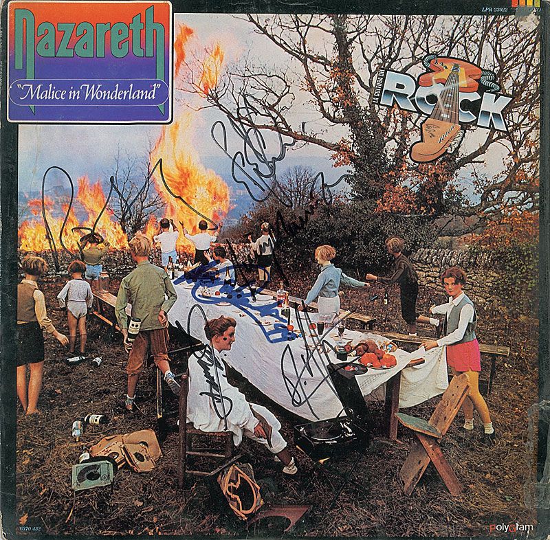 Malice in Wonderland album signed on the front cover in blue and black felt tip by Pete Agnew, Manny Charlton, Darrell Sweet, Dan McCafferty, Jimmy Murrison, and Zal Cleminson. In very good condition, with a couple of repaired tears, partial separations to top and bottom edges, price label remnants, and scattered creases. The record is included. Accompanied by a full letter of authenticity from Roger Epperson/REAL and a letter of authenticity from James Spence.