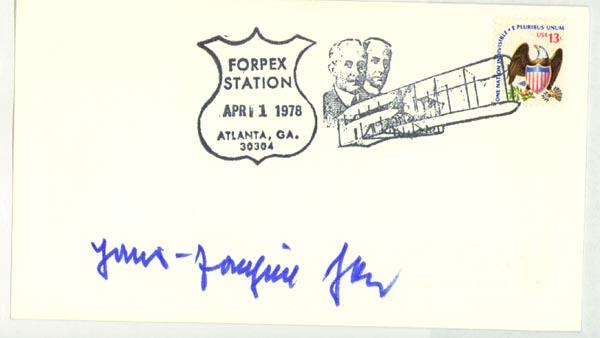 Hans-Joachim Jabs. SFDC. 6 1/2" x 3 3/4". n.p. n.d. A cover signed "Hans-Joachim Jabs" in bright blue marker by the famed Nazi pilot. The thirteen cent stamp was cancelled in Atlanta, Georgia, and there is an image of the Wright Brothers and their plane at the top.