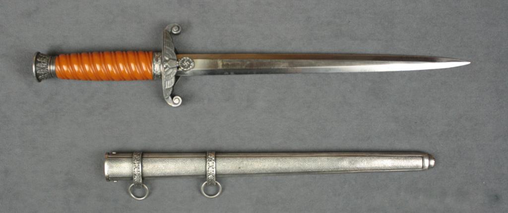 Nazi Army Officer’s dagger and scabbard, unmarked blade, spread eagle cross guard with floral leaf pommel cap; pebble finished sheath with both hanger rings; overall very good condition. Est.: $250-$500.
