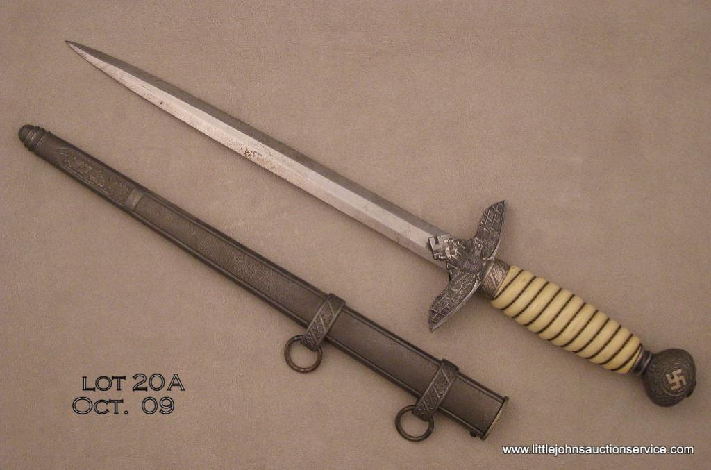 Nazi Army dagger and scabbard, approx. 17” overall, in very good condition showing the spread eagle over swastika on cross guard, wire wrapped light ivory style grips and ornate pommel; plain blade is overall very good as is the scabbard.Est.: $250-$500.