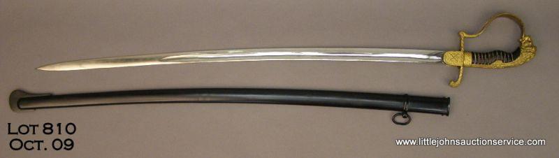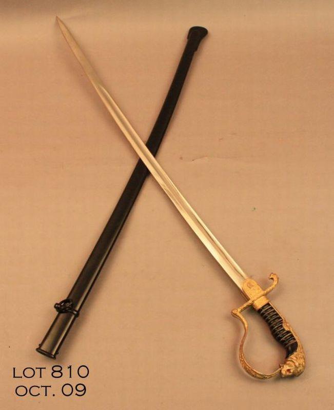 Nazi Artilllery Officer’s sword and scabbard, approx. 38” overall and in very good to excellent condition showing the majority of its original polish to the blade, nice patina to the original gold finish to the guard and lion pommel; wirewrap remains on the grip and the scabbard shows a quality refinish to its body and hanging ring. Est.: $150-$250.