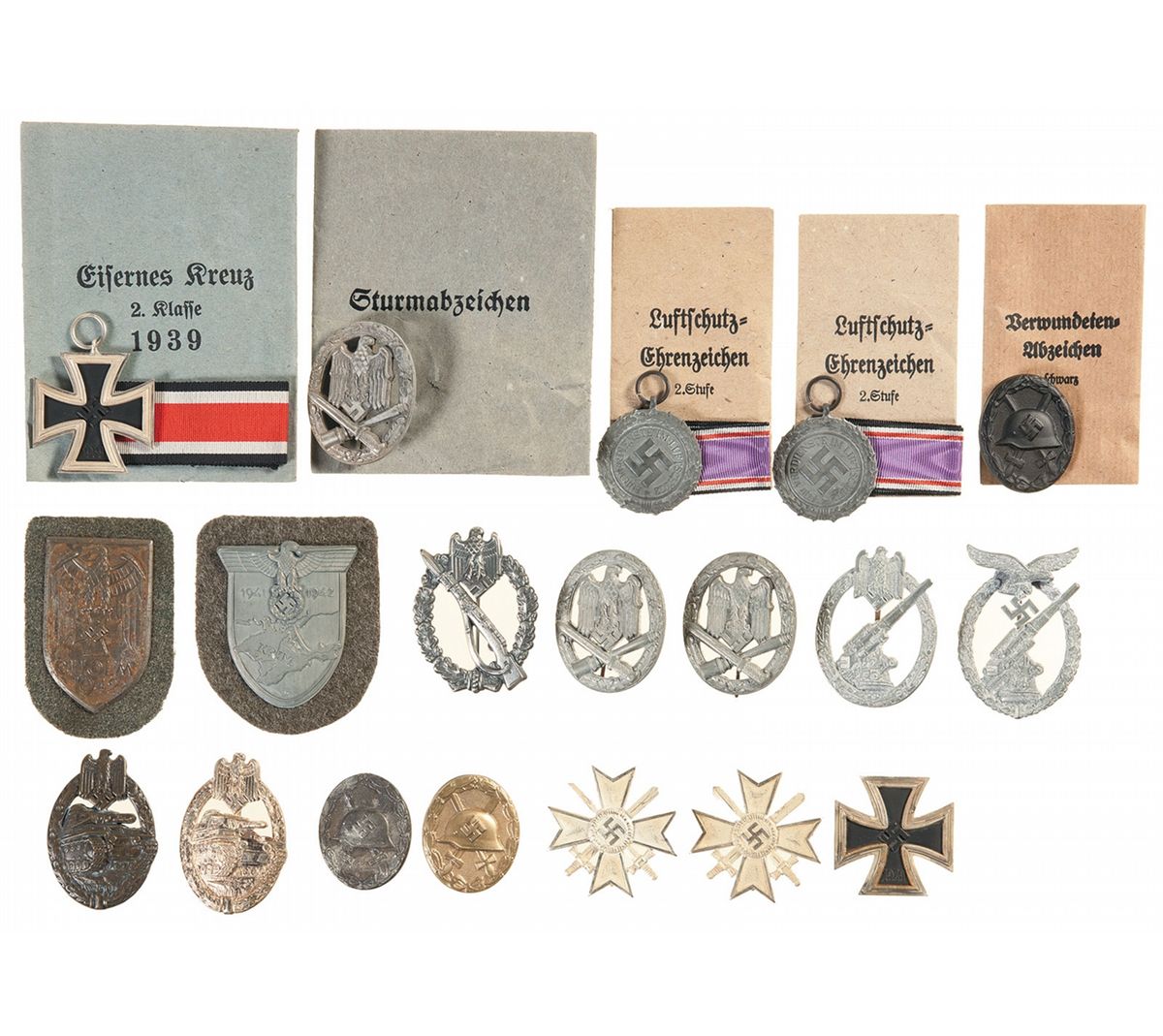 Iron Cross 2nd Class in envelope, General Assault badge in envelop, 2 Luftschutz 2nd Class in envelopes, black Wound Badge in envelope, 2 War Merit Cross 1st class with swords, 2 tank badge, infantry badge, silver Wound Badge, gold Wound Badge, 2 General Assault badges, Luftwaffe flak badge, Army flak badge, Krim arm shield, Cholm arm shield, Iron Cross 1st Class.