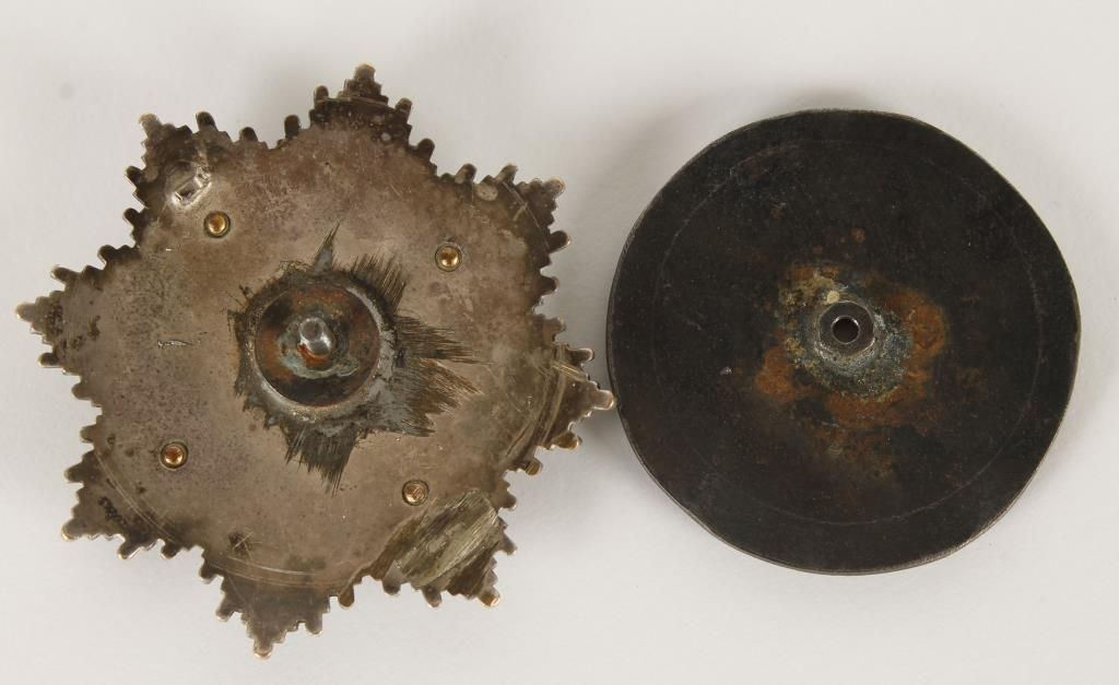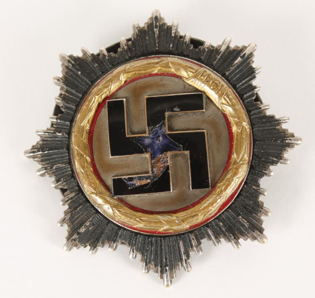 Pin back has been altered by solder to screw back. Shows age, discoloration, damage to swastika, and scratches on back.