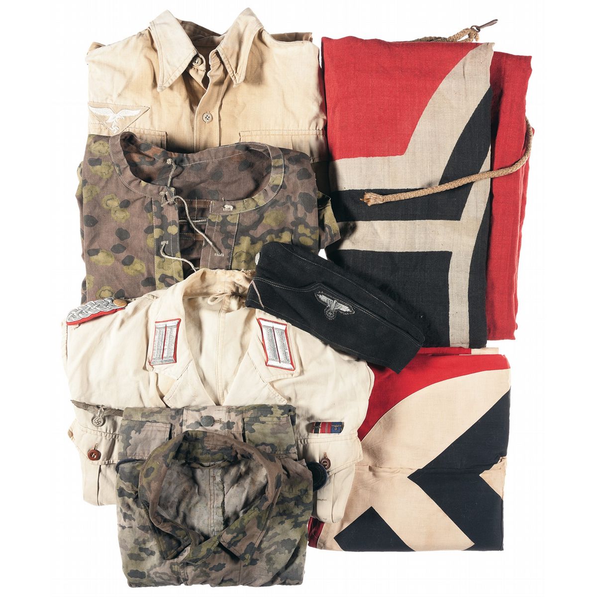 Approximately 45"x61" Nazi flag (fair), approximately 68"x130" Nazi flag (poor), Luftwaffe summer shirt (fair), Nazi artillery officer summer tunic (poor). Camouflage jacket with button front (fair), camouflage jacket with lace up front (very good), and overseas cap with death head insignia.