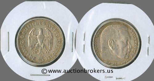 Nazi Germany 5 mark 1936A XF; Decent condition silver coin