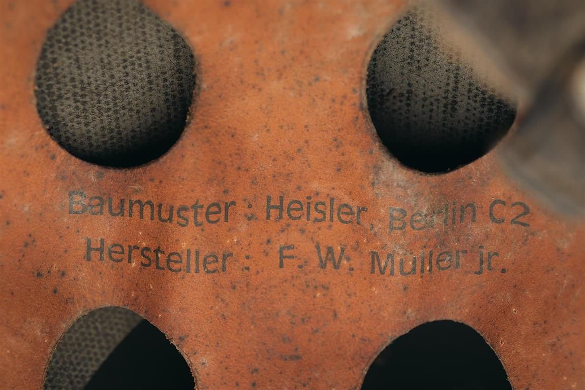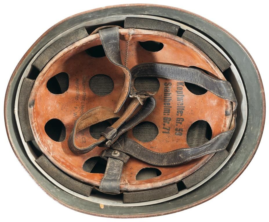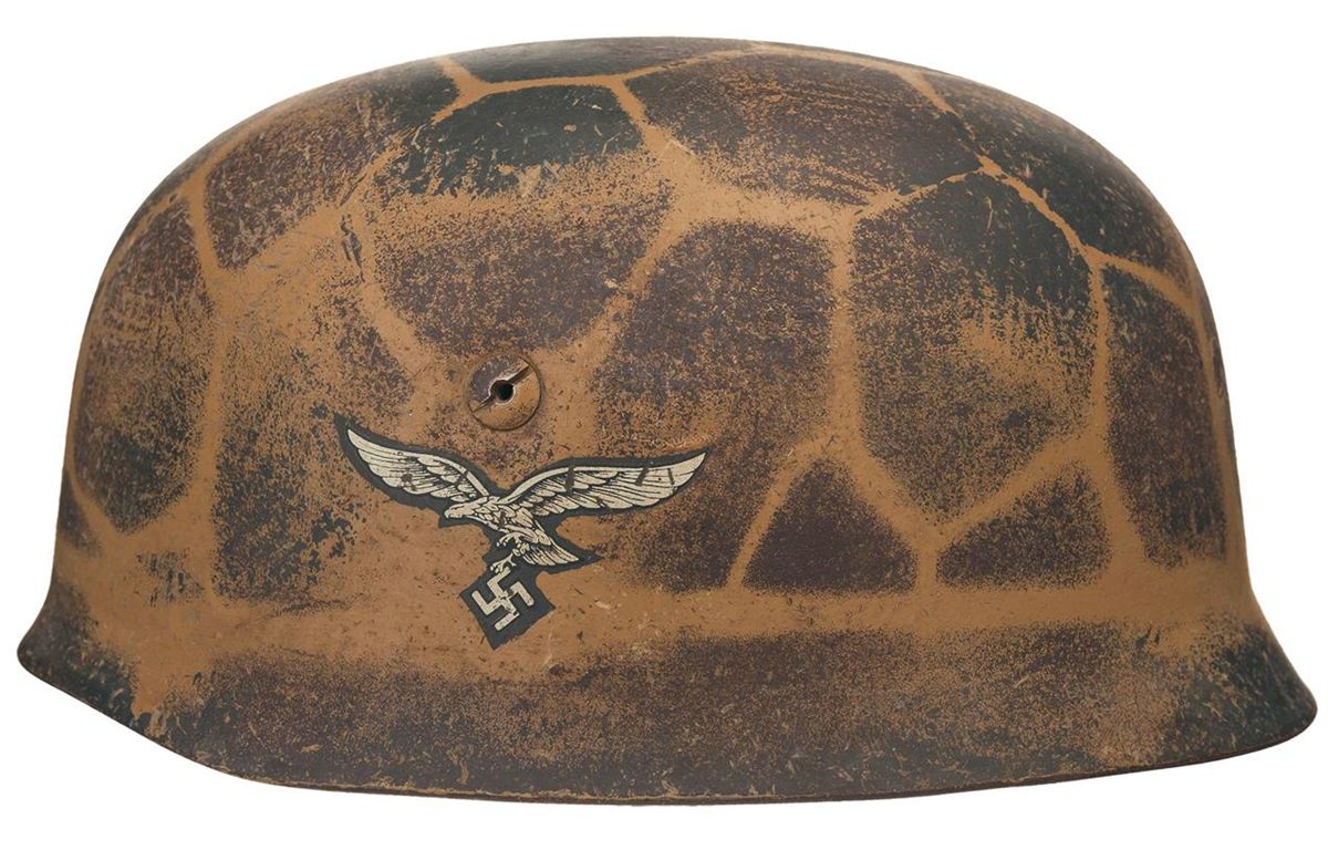 Also known as the Model 1938, the Fallschirmhelm was a Stahlhelm variant with the brim cut down to reduce drag, thicker webbing and lining, and a more sophisticated multi-point strap arrangement. Originally finished in a deep green, the helmet was upgraded with camouflage; a protective mask was applied over the single Luftwaffe eagle decal on the left side, with a solid tan base coat applied over the exterior, then additional masking in a chiefly hexagonal pattern (possibly chicken wire) was applied before the tan was oversprayed with darker brown and green. The interior retains the original color with "4457" and "ET 71" stamped inside the brim, a series of 4 "flathead" bolts retaining the inner webbing, and the crown of the webbing stamped in black "Kopfweite: Gr.59/Stahlhelm: Gr. 71/Baumuster: Heisler, Berlin C2/Hersteller: F.W. Muller Jr."