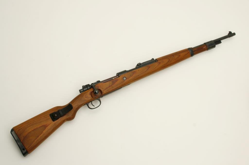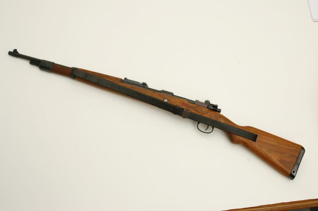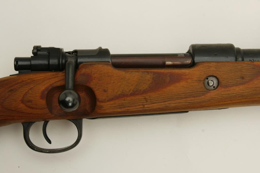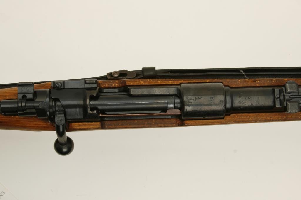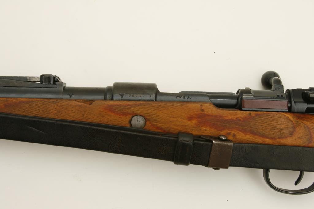 8 mm caliber, serial #26237. The rifle is in very good overall condition with a 24” import marked barrel. The barrel and action retain the majority of their blued finish. The action is dated 1944 and appears to have been arsenal rebuilt during the period of use. The barrel and front ring are both Nazi proofed. The smooth wood stocks are in very good condition with the stock bearing the same serialization as the action. The stock ends with a smooth metal butt plate. The rifle features a period, leather military sling. The bore is good, the action crisp and markings are sharp on this superior World War II era German Mauser. (C+R) Est.: $300-$600.
