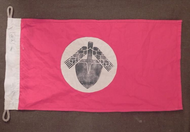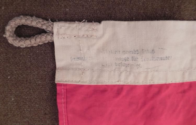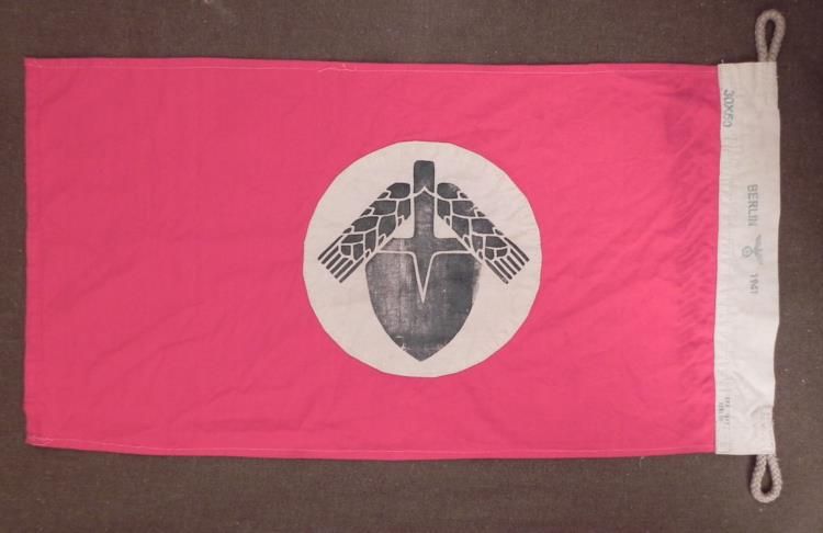 This is a reproduction Nazi flag of the Nationalsozialistischer Arbeitsdienst. It has authentic looking multi-piece construction. There is a shovel on either side. The seam at the edge is stamped Berlin 1941, with eagle and swastika. This is a great looking piece for display, almost as good as the real thing.