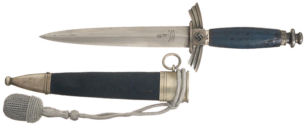 A more overt military outgrowth of the civilian "Luftsportverband", the Nationalsozialistisches Fliegerkorps (National Socialist Flyers Corps), established 1937, served as a training arm/ reserve unit for the Luftwaffe, producing glider troops, pilots, and radiomen. 6 7/8 inch blade, with the Heller Brothers (Schweina) logo on one side, winged cross guard, blue leather wrapped sheath and rounded pommel cap. With a matching sheath and silver wire portapee with solid acorn.