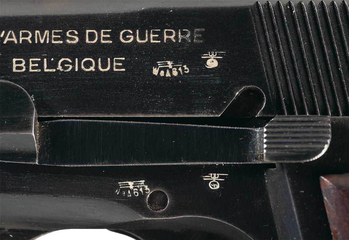 Manufactured during the German occupation of Belgium during World War II. Blade front and tangent rear sights, with the 2-line Herstal address over the Browning patent marking on the slide, "eagle/swastika" and "WaA613" proofs and matching numbers on the slide, barrel and frame. Serrated ring hammer, smooth back strap and checkered hardwood grips.