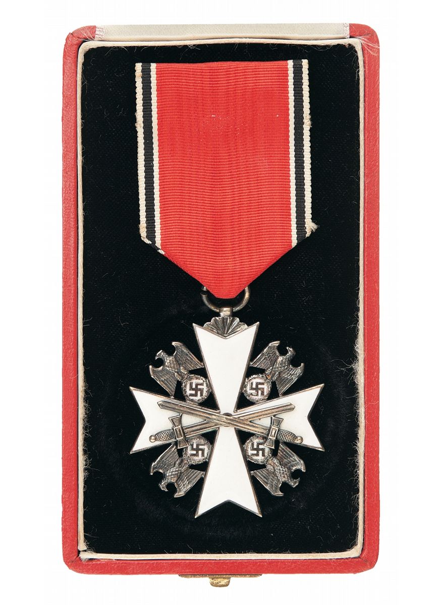Introduced in 1937 and revised in 1939, the Order of the German Eagle was chiefly for issue to non-Germans, especially foreign diplomatic agents and leaders, both as tokens of esteem and as a reward for services provided. The 'with Swords' variant was specifically for recipients who were also members of the military. Based around a white enamel filled Maltese cross, 1 3/4 inches wide, with Nazi Eagles between the arms holding white enamel filled swastika wreathes, a crossed pair of swords on the front, and a fan-shaped extension on top attached to a red, white and black pin backed ribbon. With a red leatherette case marked for a 3rd Class Order.