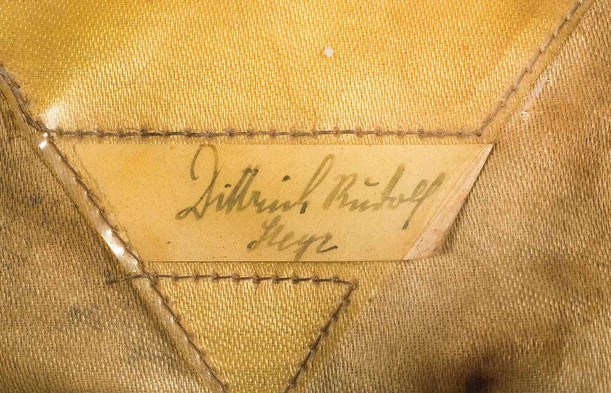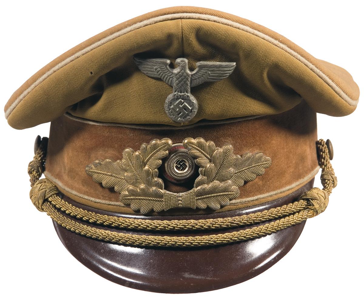 Placed in command of a city or a number of rural towns, a Kreisleiter (District Leader) answered directly to the Gauleiter (State Leader), who would then answer directly to Der Fuhrer. Peaked cap, tan felt construction with white piping, Nazi eagle on the peak, and a brown velvet band with gold washed wreath around a red and black enameled silver cockade. Brown patent leather visor with gold cord chinstrap, leather sweatband and silk lining. Inside the hat is a faint signature over "Steyr".