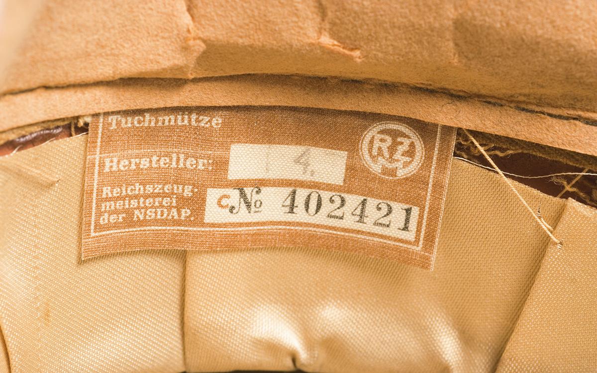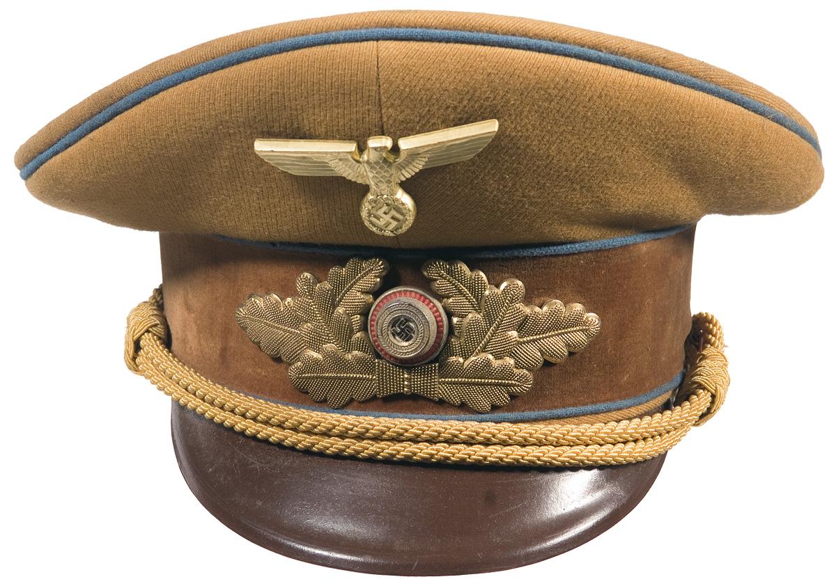 Peaked style cap, light brown felt construction with blue piping, Nazi leader's eagle on the peak, and a brown velvet band with gold washed wreath around a red and black enameled silver cockade. Brown patent leather visor with gold cord chinstrap, leather sweatband and silk lining. A marking inside the lining has been marked over, and a RZM property tag is present under the band.