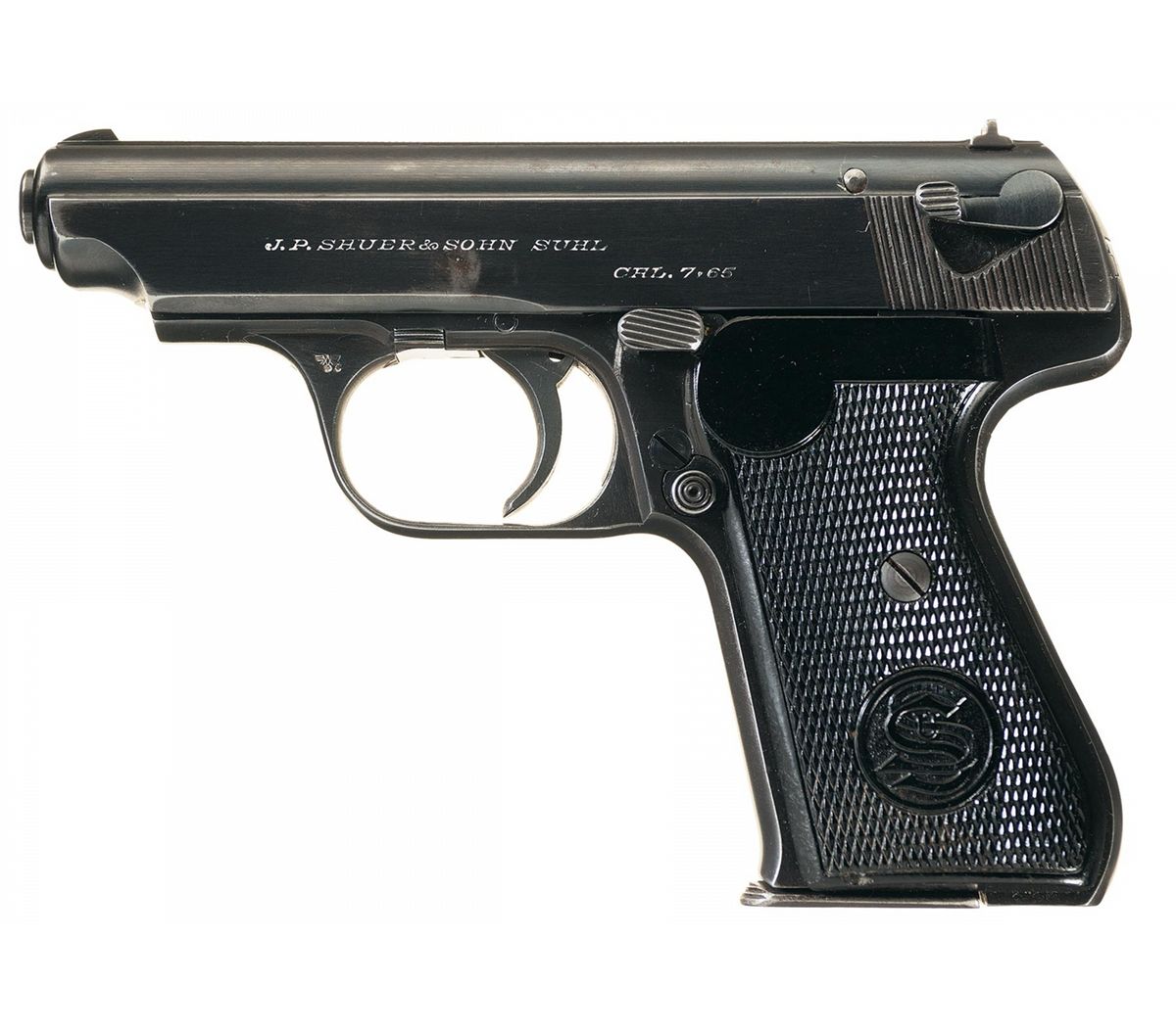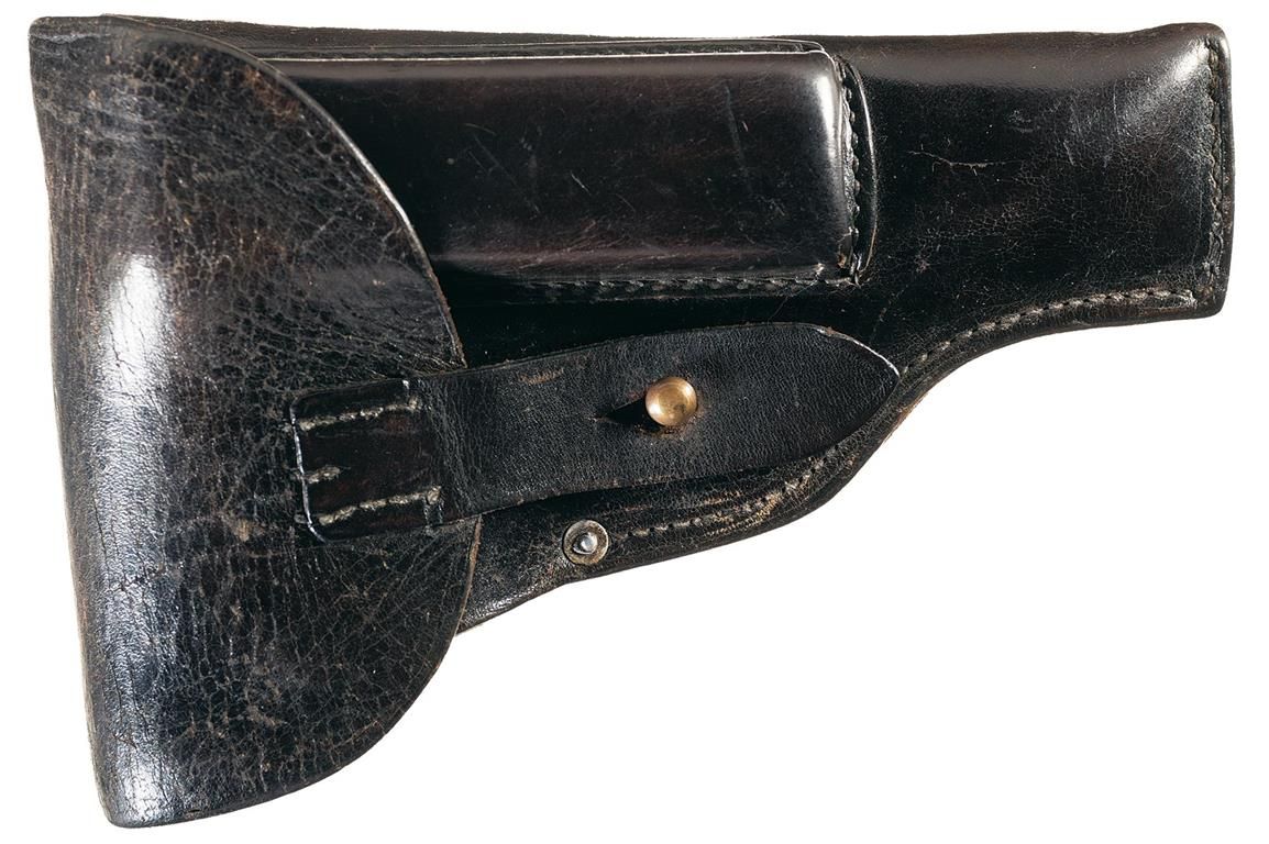 Fixed sights, with the Suhl address and caliber markings on the left side of the slide, "PATENT" on the reverse, "eagle/N" proofs on the right side of the slide, frame and muzzle, and an "eagle/C" Police Acceptance Stamp on the left trigger guard web. With a serrated safety and decocker, and checkered "SuS" monogram grips. With a black leather holster marked "KernKlager&Cle/1940/Berlin", and two magazines, both numbered "280" on the base.