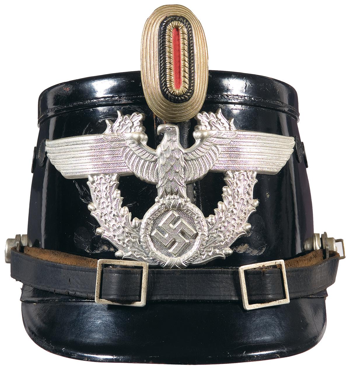 Black leather construction, with a pair of wire mesh vents on either side, a stamped aluminum Nazi Police eagle on the front along with a detachable metal cockade, black leather chinstrap with silver painted swivels, black and green patent leather visor and neck protector, and black interior with brown leather webbing.