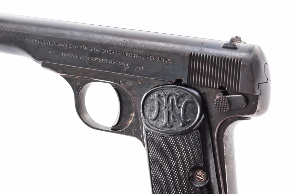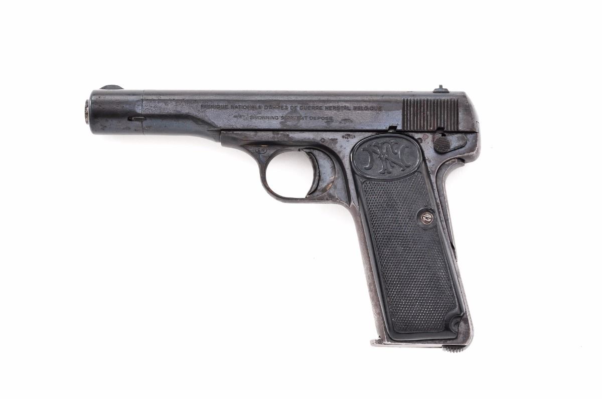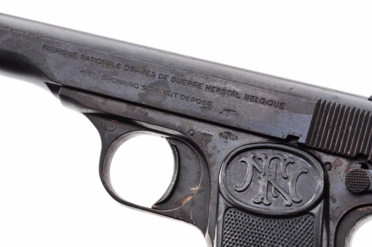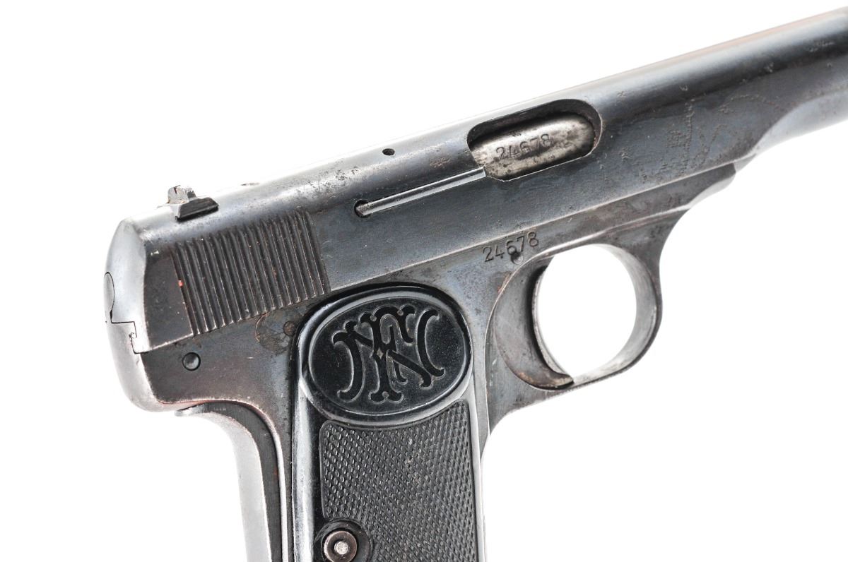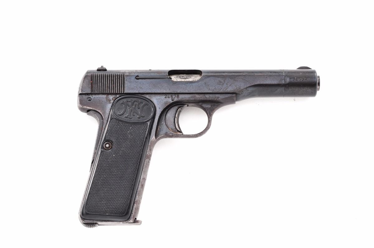 Nazi Proofed Browning Model 1922 Semi-Automatic Pistol, #24678, .32 ACP cal., 4-1/2'' barrel, blue finish, checkered FN hard rubber grips, standard sights, with one FN marked magazine.  Left side of slide and frame with Waffenampt 103 proofmarks, as well as Nazi proofmarks to the barrel.  Barrel, frame and slide with all matching serial numbers.  Condition is good retaining approx. 75% blue with most of the losses to front and back grip strap; remaining metal surfaces with an overall dark patina; slide with light corrosion.  Grips with some flattening to checkers, scratches and impressions to flat edges.  Action is tight, bore is good.  Est.:  $250-$350.  (C&R)
