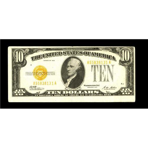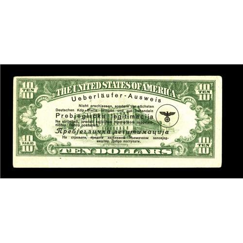 <B>Nazi Propaganda Note Schwan-Boling 412.</B></I><BR>This is a slightly oversized German propaganda piece dated Series of 1943 that uses the design and colors of a United States small size Gold Certificate, right down to the Treasury signatures of Wood and Mellon. The back is overprinted in three languages. Interestingly, "P.S.K. 83" has replaced "TEN" in one of the denomination ribbons on the back. Thoughts are that this is the German psychological warfare unit that designed these notes. <B>About Uncirculated,</B></I> with a corner and center fold.<BR><I>From The William A. "Bill" Bond Collection</B></I><BR><BR><b>Shipping:</b> Coin/Currency (<a target="_blank" href="http://www.heritageauctions.com/common/shipping.php">view shipping information</a>)