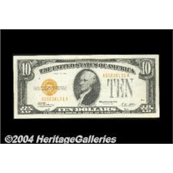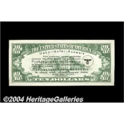 Nazi Propaganda NoteAn oversize German propaganda piece dated 1943 and using the design and colors of a United States small size Gold Certificate, right down to the Treasury signatures. The reverse is printed in three languages. Uncirculated, the first piece of its type we've ever handled. <BR><BR><B>Important notice:</B> Heritage usually auctions material at the rate of 200-250 lots per hour. On some occasions eBay Live bid software or the Internet may not be able to keep up with the pace of the auction. We recommend placing a realistic absentee bid now as insurance to avoid disappointment. Occasionally the auctioneer may eliminate or reject an eBay Live bid, and the auctioneer may also reopen a lot after the close of the eBay live bidding (usually because we missed an audience bid), and may reject your bid even if it shows you as the winning bidder. By bidding via eBay Live, you agree that Heritage may award the lot to another bidder at its sole discretion under the circumstances described above or any other reasonable circumstances. Since eBay bids are not shown to us until we open the lot on the floor, we treat those bids just like floor bids. In most cases the floor responds before the eBay bid is presented to us, due to Internet lag time, so for consistency we have made it a policy that floor bids are always considered first over tie eBay live bids. Also please note that all Heritage lots purchased through eBay Live carry a 20% Buyer's Premium. Please make sure you read the Terms and Conditions before you bid. <BR><BR><B>IMPORTANT ANNOUNCEMENT ABOUT RESERVES:</B> Heritage now divulges all reserves on its web site 7 days before every auction. If you want to know whether the reserve on this lot has been met, and if not, what the reserve amount is, please visit this lot page on the HeritageCoin.com web site, or email: bid@HeritageGalleries.com