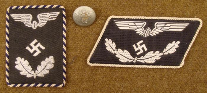 The patches are black, with silver threading depicting the winged wheels, swastika, and oak leaves. The borders have a rope weave edge. They measure 2" x 2 1/2" and 3 1/2" x 1 /2". The button features an eagle and swastika, and measures nearly 3/4" in diameter.