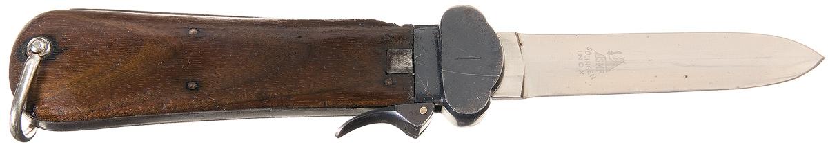 Produced by SMF in Solingen around 1943. Double edged blade, 3 4/5" long, with spear point and makers mark on one side over the "INOX" stainless steel marking. Blue finished hilt hardware, with smooth wood grip slabs, lanyard swivel and a 3 2/5" folding spike.