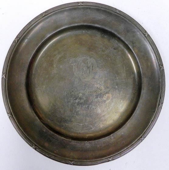 This is a Nazi SS Award Plate awarded to the soldiers for their service rendered. The SS logo, the individual who was awarded the plate, and date are in the middle. On the back is marked RZM and it is 9" in diameter.