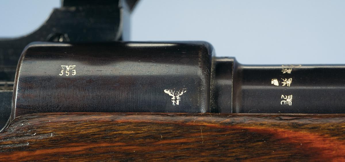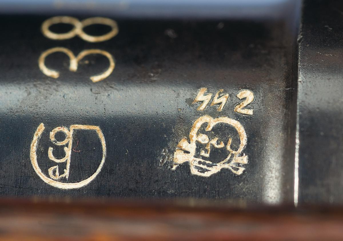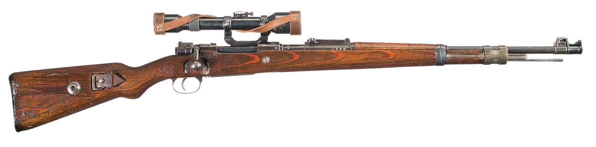 This is a early WWII German Gewehr rifle that was originally converted into a short side rail type sniper rifle, probably circa 1933/34, and subsequently rebuilt or overhauled at the Mauser factory in 1939/40. The receiver is the correct early Gewehr 98 style, with the receiver ring markings removed, and correctly proofed "eagle/ N" proof. Later, it was returned to the factory for repair or overhaul, fitted with the later pattern improved short side base and mount, and rebarreled with a Geco 1938 dated Bohler steel barrel. The right side of the receiver ring has also been reproofed with a single Walther "eagle/ 359" Waffenamt. Later pattern scope base, with three main screws, three side-position locking screws and two small taper pins. A "sig runes 2/ Totenkopf" proof, indicating reissue by the second "SS" ordnance depot, is present on the barrel, along with the intertwined "Geco," and "38 Bo8" makers marks next to three early Mauser "eagle/ 26" proofs. Original rear sight leaf and spring assembly, correctly marked "k" over "S/42" along with an early Mauser "eagle/ 63" proof, installed on the replacement Mauser factory sight base marked "42" along with three "eagle/ WaA63" proofs. Original Gewehr trigger guard and floor plate, with visible partial Imperial proofs. A single "eagle/N" proof is present on the underside of the bolt handle, with the original serial number milled off and restamped to match the rifle. It is fitted with early, non-matching milled barrel bands. Laminated stock and handguard, with the circa 1939/40 flat, though neither match the rifle. The mount is the correct short side rail type that is fitted with an Ajacks commercial scope, correctly marked on the left side of the windage base with the Death's Head and "SS" runic proofs, along with "Dienstglas" markings for service glass, the right side is marked "AJACK 38716", and the left side of the scope tube is correctly engraved with serial number "5486". The side of the scope mount and the base have been renumbered to match the rifle, (both with a different style and size of number stamps). Complete with a early brown cross-hatched leather sling, cleaning rod and push-on front sight/muzzle cover.