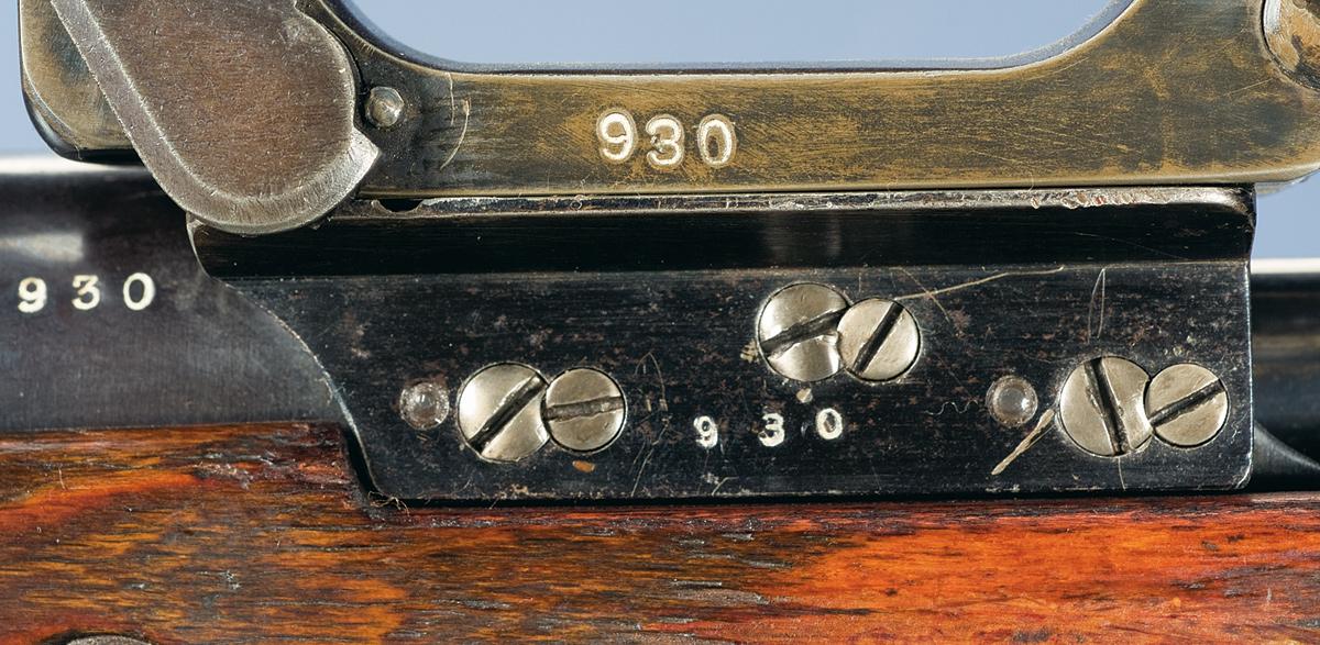 Condition: Arsenal reworked and partially refurbished (barrel bands), the barrel and receiver retaining 90% of the arsenal blue finish with edge and high spot wear, with some thinning on the receiver rings with some very minor pitting on the exposed section of the barrel, and the trigger guard and floor plate have 80% of the blue finish remaining mostly in the protected areas, with the exposed metal surfaces having turned a gray patina. 85% of the blue finish remains on the barrel bands, with the balance turning a light brown patina. Stock is good as period repaired, with a 3" mended section on the toe, handling marks, light nicks and pressure dings. The scope and mount have 90% of the original blue finish with wear on the rear eyepiece with some thinning and browning on the actual mount. The optics are very clear and the windage knob works correctly. Mechanically excellent. A nice representative example of an early SS short side rail rifle.