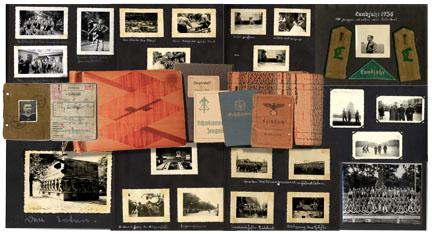 Large grouping of Nazi soldier memorabilia, including two photo albums, various documents and a passport noting his birth in 1923. The more interesting of the two albums, dated 1938, depicts the soldier's year at ''Landjahr,'' Hitler's Nazi youth training camp, with photos of young boys engaging in various tasks, and with the Nazi Swastika depicted. Album includes original Landjahr uniform patches glued to inside cover. Albums measure 10'' x 7.5'' and 11'' x 7.5'' and most photos measure 3.5'' x 2.5''. Near fine.
