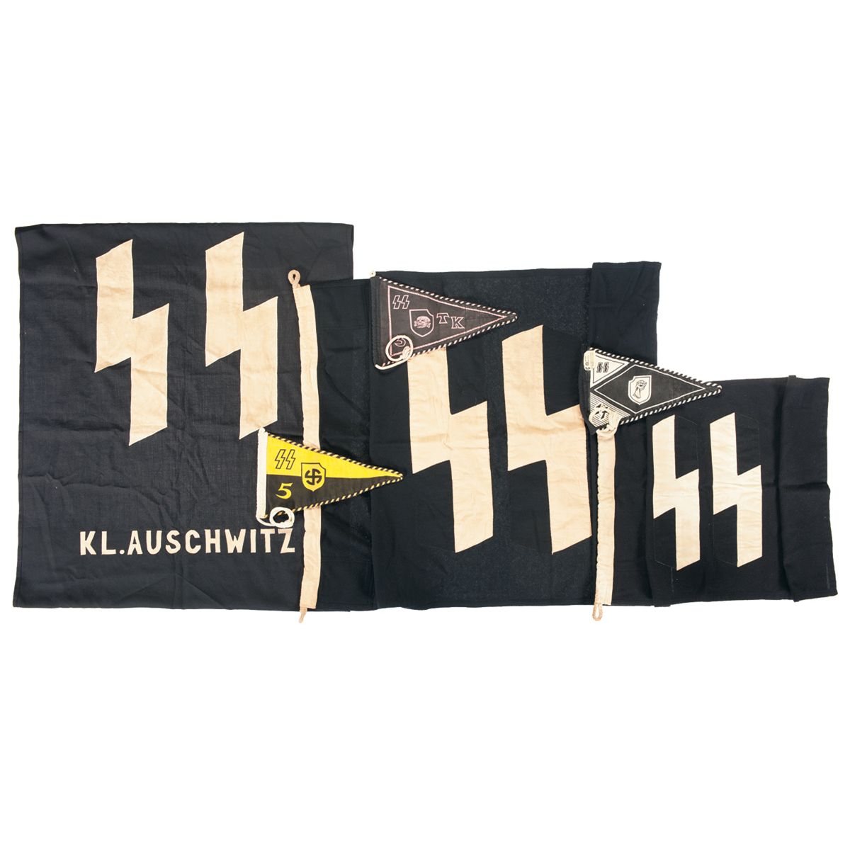1 SS flag, 53" x 27". 1 SS flag, 29" x 18 1/2". 1 SS hanging banner marked "KL . AUSCHWITZ", 44" x 28". 3 SS pennants, 12" x 7 1/2". Measurements approximate.