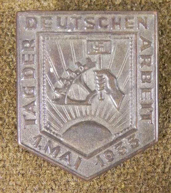 This is a 1933 Nazi tinnie celebrating the Day of German Workers, May 1st. The design shows part of a cog wheel, and hand holding hammer with swastika. The size is 1 1/4 x 1 1/2". It is in very good condition, with pin back. * This is a nice original for a collection.