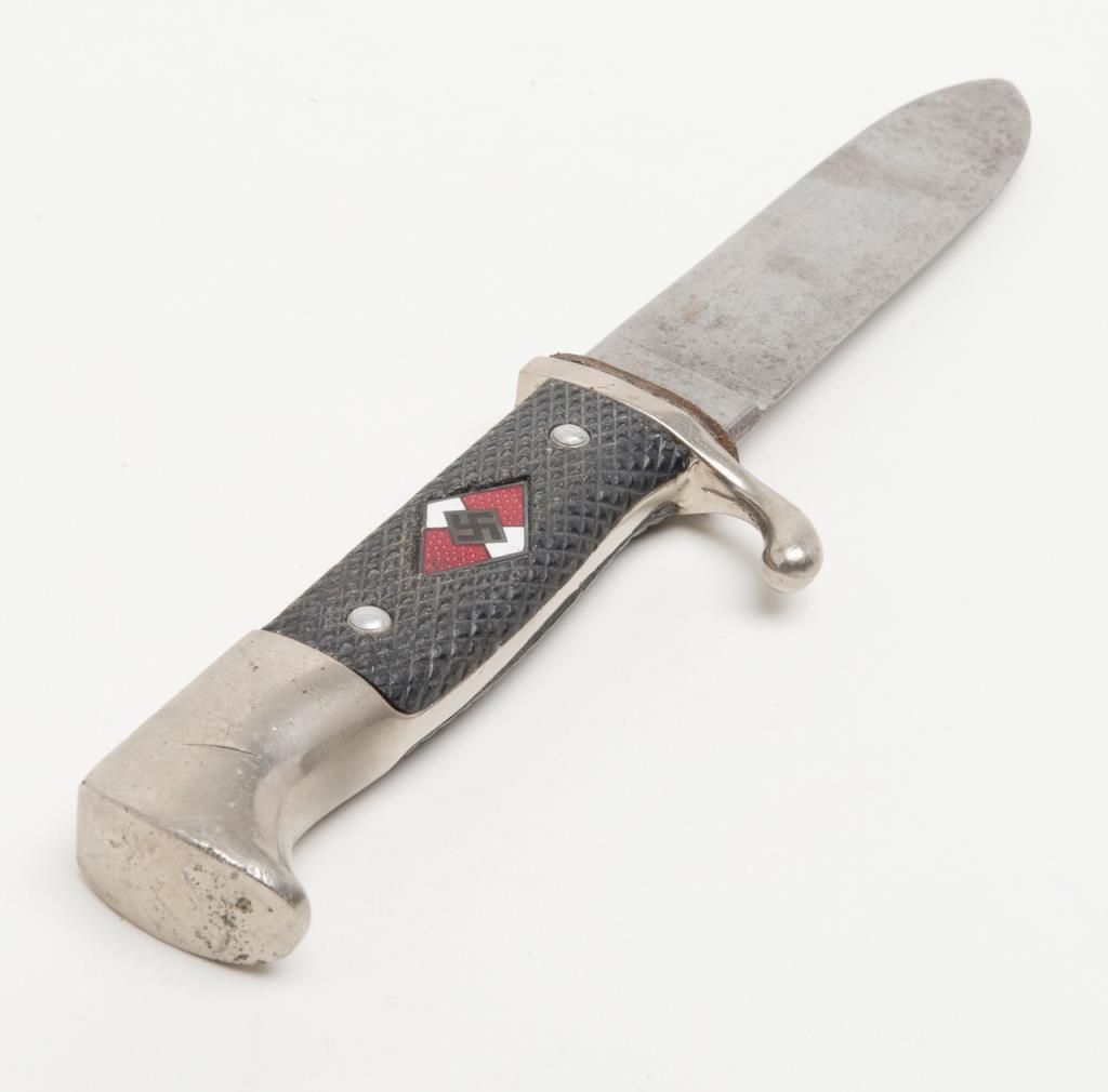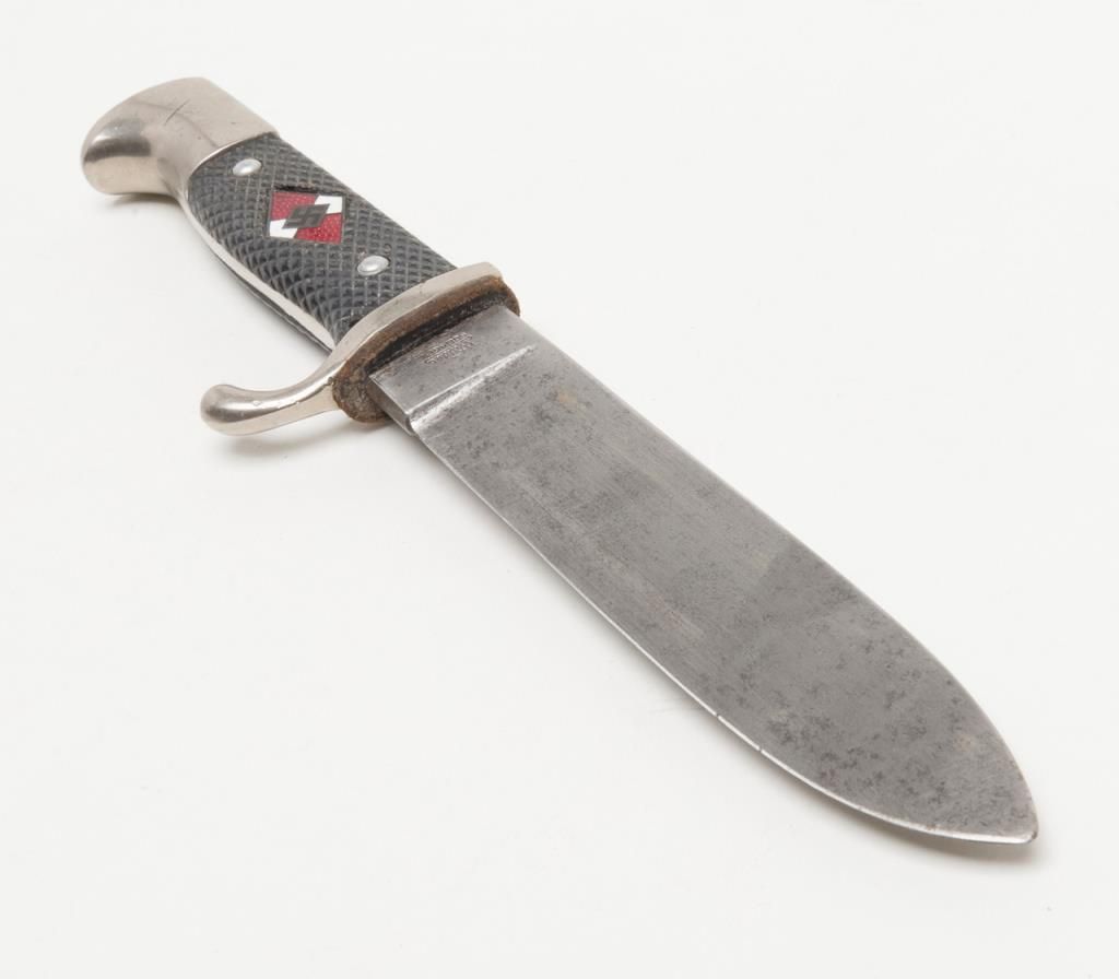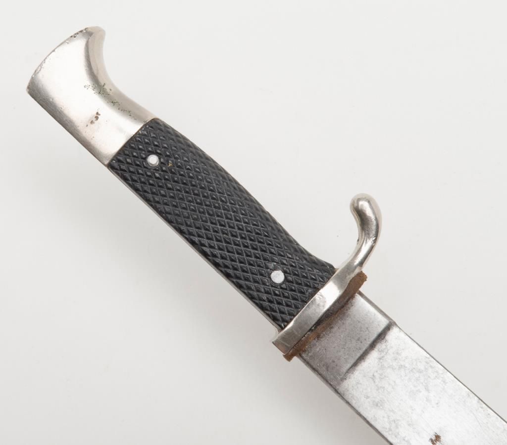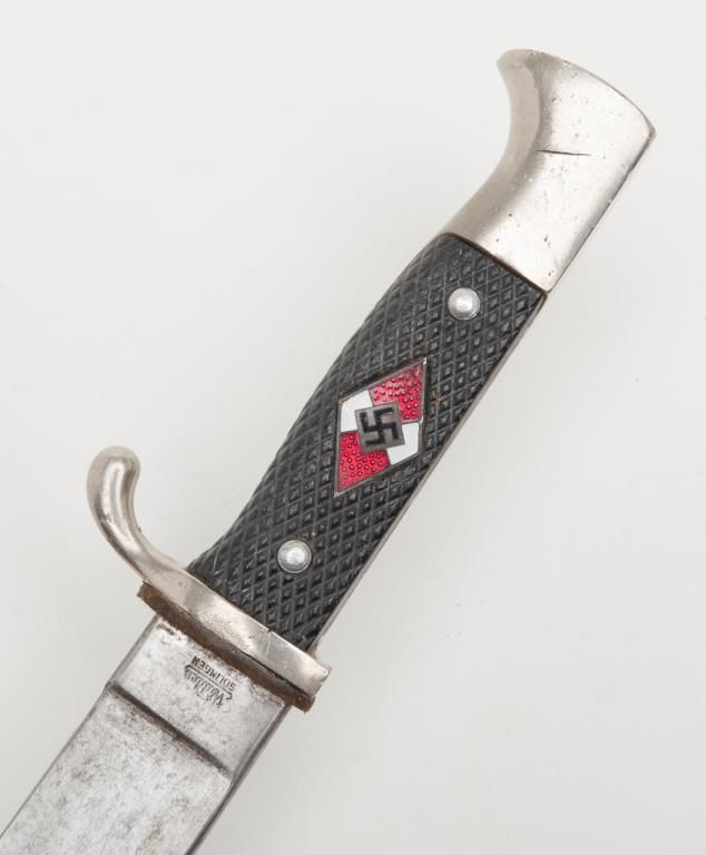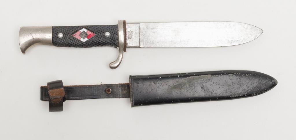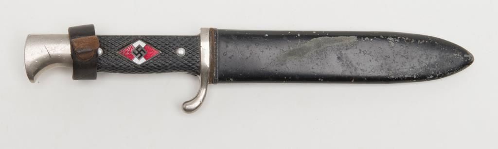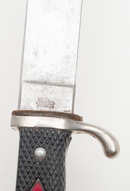 Nazi Youth Dagger with 5 ½“ blade, scabbard and leather hanger. The knife is in overall good to very good condition, showing typical marks and use to the blade. The scabbard shows wear also with a significant loss of its black finish. The bladeis marked “Widdeg, Solingen” near the finger guard. The checkered hard rubber, Nazi marked scales are in overall very good condition. (Exempt). Est.: $100-$200