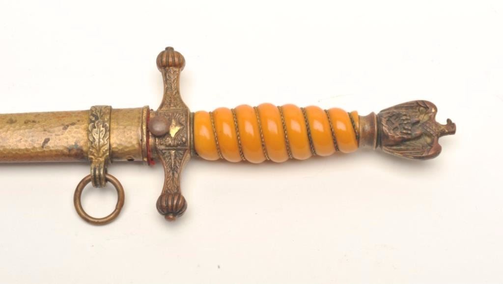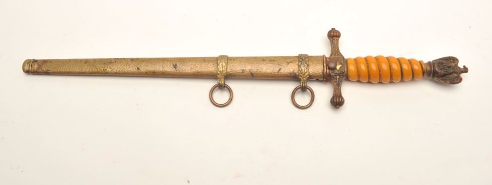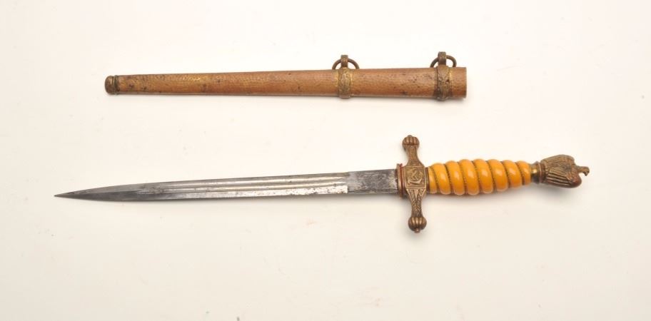 Nazi era German Naval dagger with pebble grain scabbard; Alcosa marked blade; original and untouched. Est.: $500-$1,000.