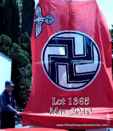 Nazi military flag with army eagle, reinforced hangars with metal hooks, probably from headquarters. Measures approx. 13' by 8'. Absolutely original, good condition. Est: $350 - $700