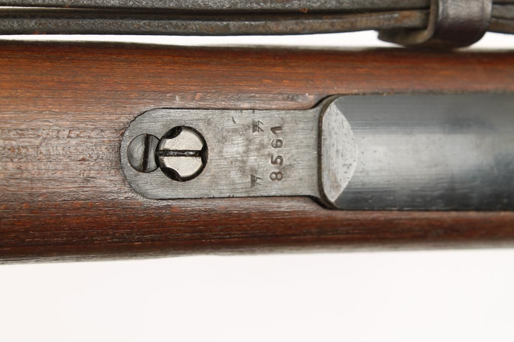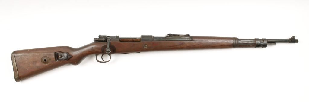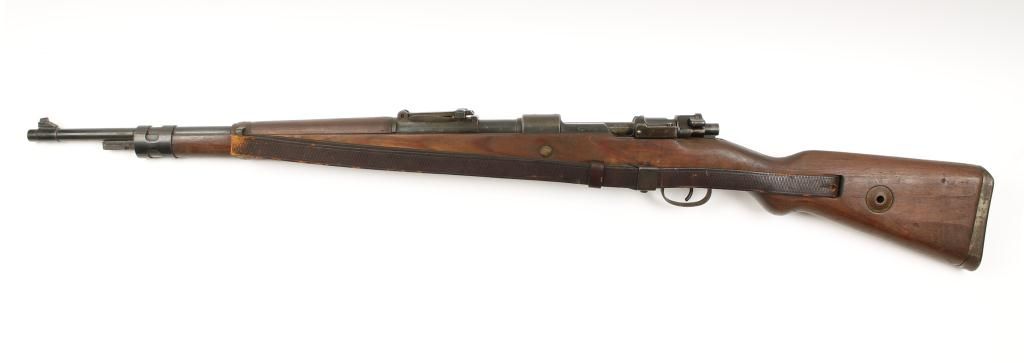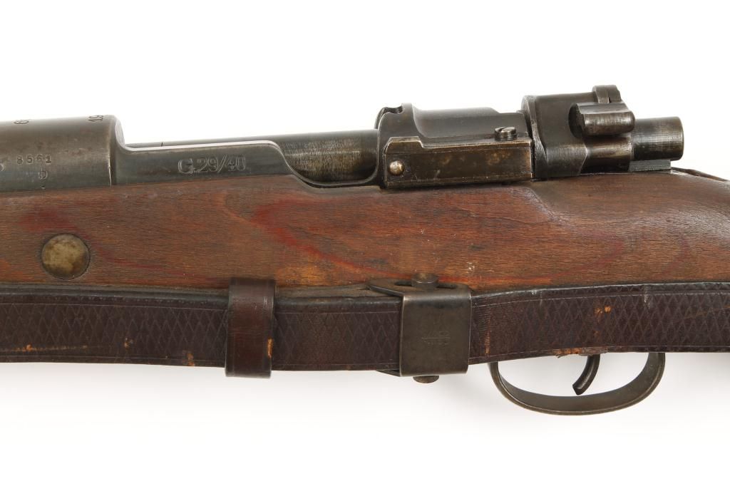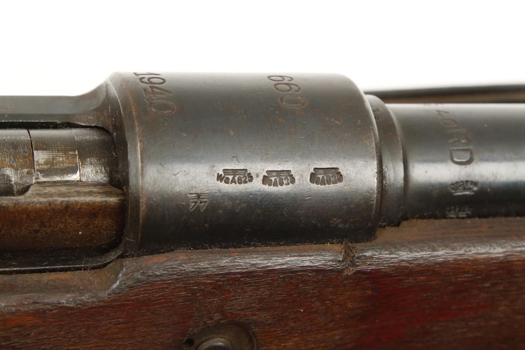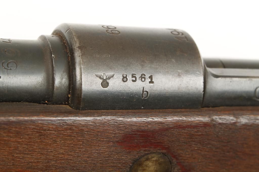Nazi proofed 98K Mauser rifle manufacturer coded 660 and 1940 dated with marking at breech 69-40- RD and serial numbered 8561. The metal surfaces show 50% to 60% original military blue finish going to brown with some beginning erosion and pinprick pitting. The stock is very good plus with good nazi inspection marks. A leather sling is included and all matching except bolt which is marked number 1258. The action is good and the bore is bright. From a local estate just like it was brought back in World War II. Est.: $800 -$1,600.