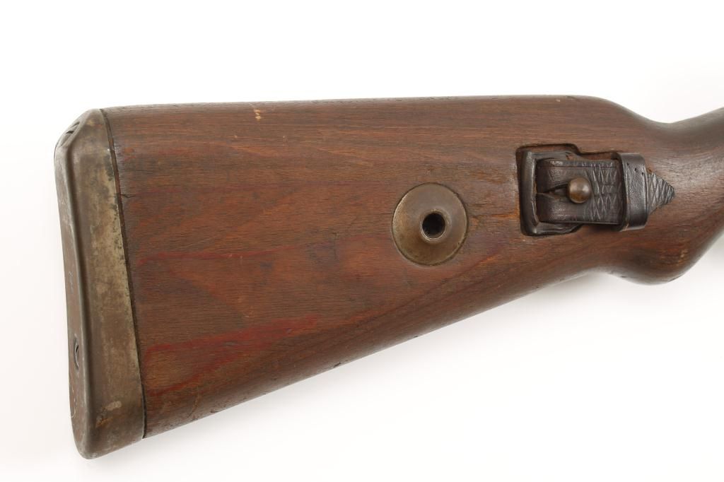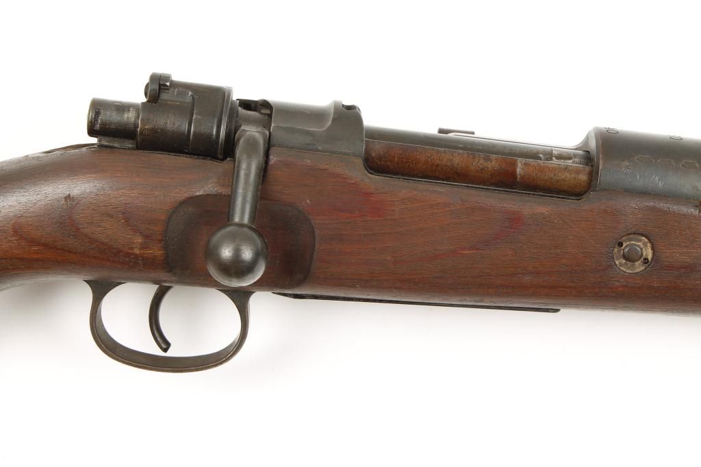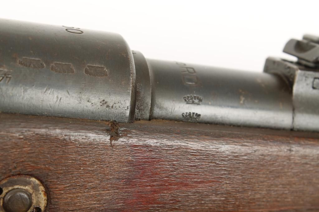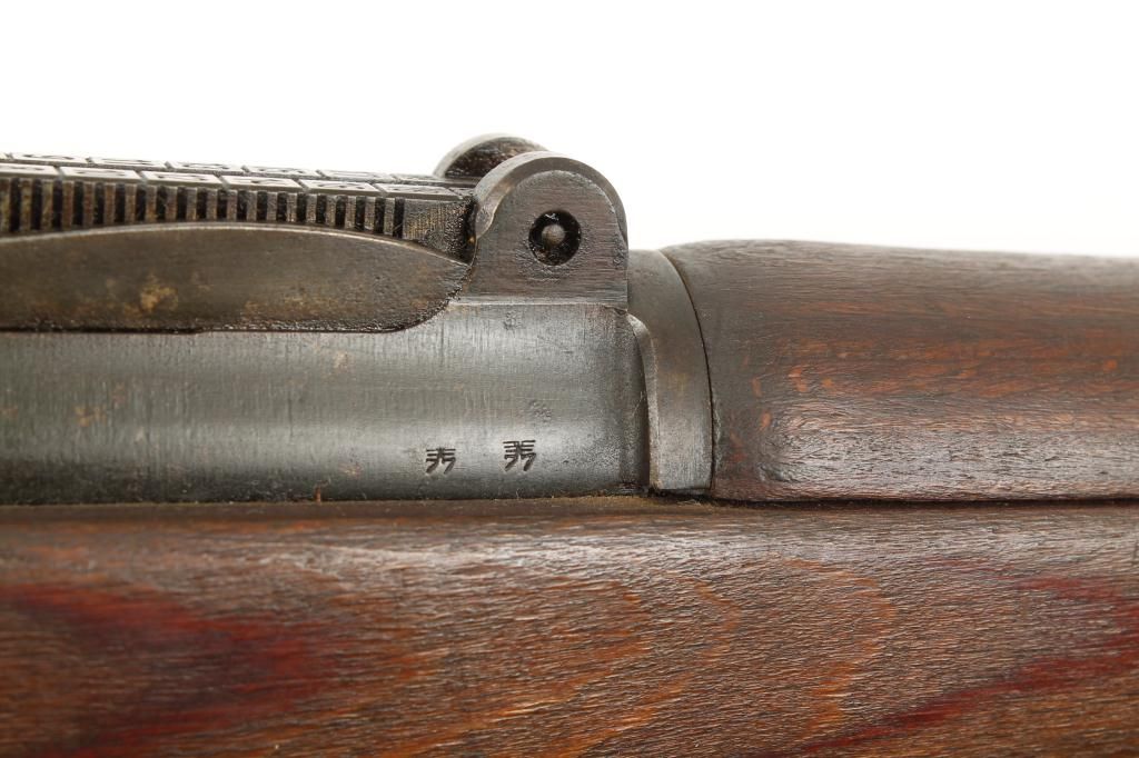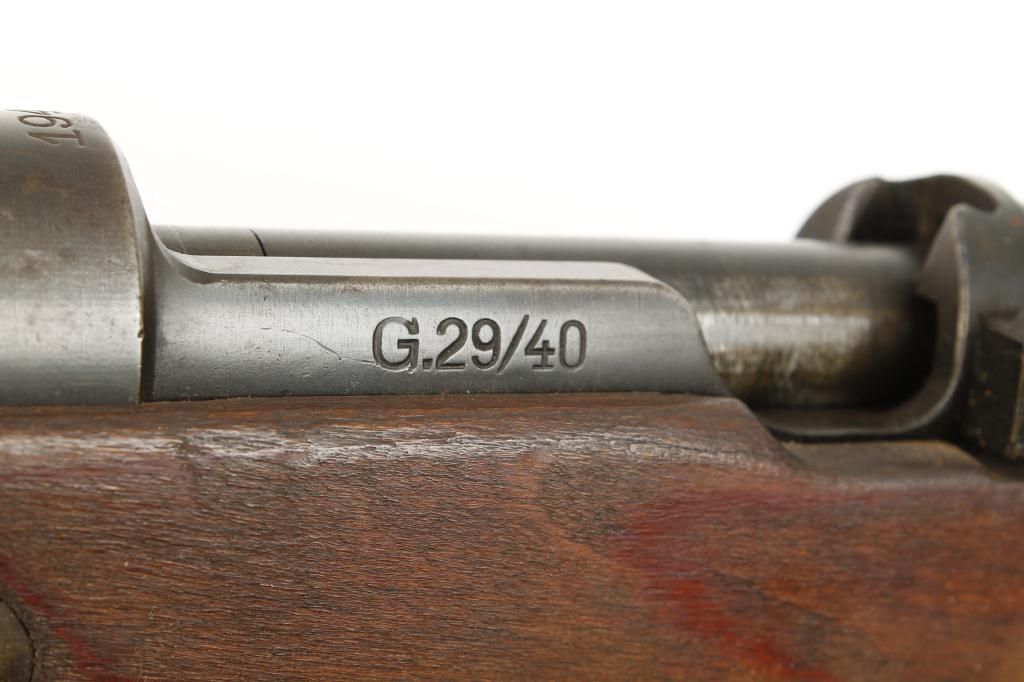 Nazi proofed 98K Mauser rifle manufacturer coded 660 and 1940 dated with marking at breech 69-40- RD and serial numbered 8561. The metal surfaces show 50% to 60% original military blue finish going to brown with some beginning erosion and pinprick pitting. The stock is very good plus with good nazi inspection marks. A leather sling is included and all matching except bolt which is marked number 1258. The action is good and the bore is bright. From a local estate just like it was brought back in World War II. Est.: $800 -$1,600.