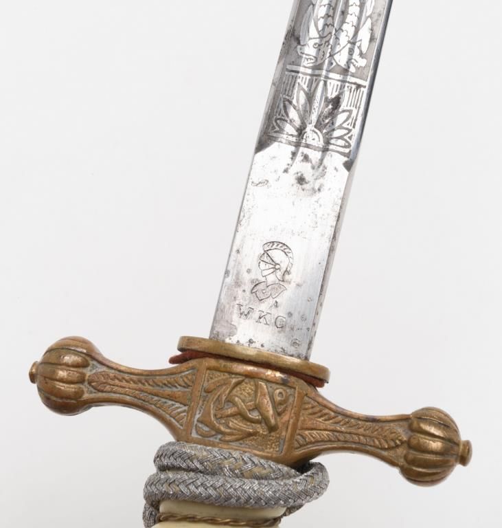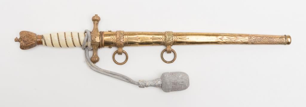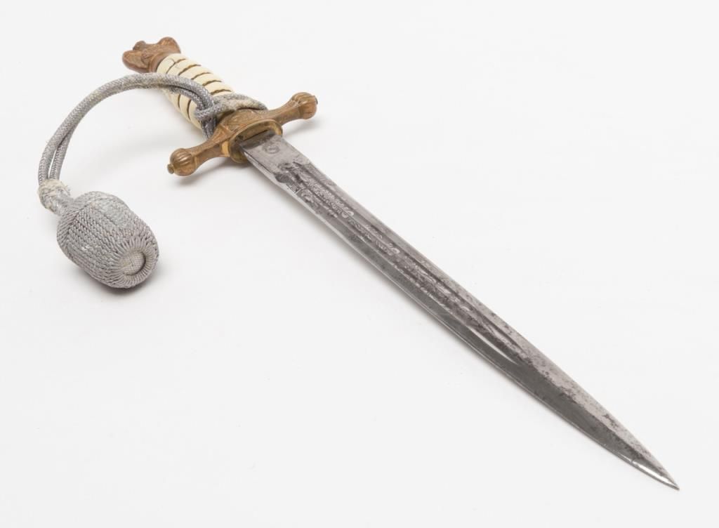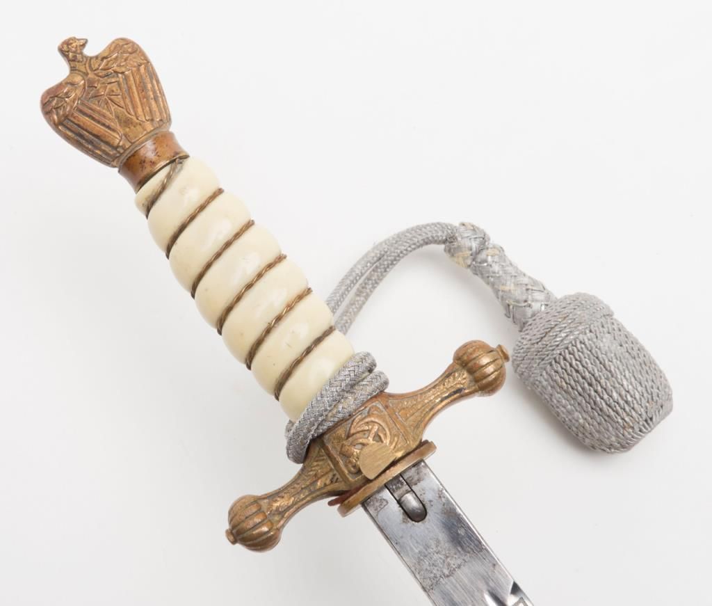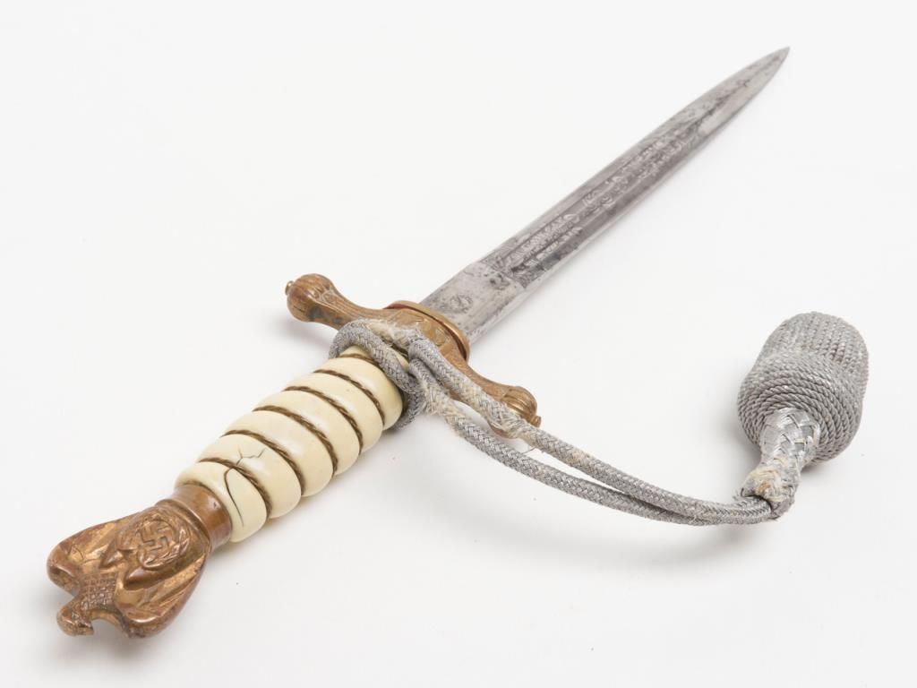 Nazi style reproduction dagger with metal sheath and silver braided portepee in overall good condition. Est.: $50-$100.